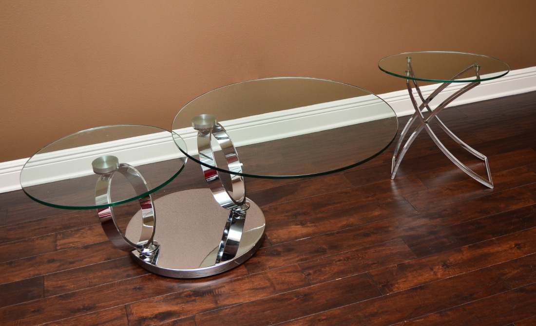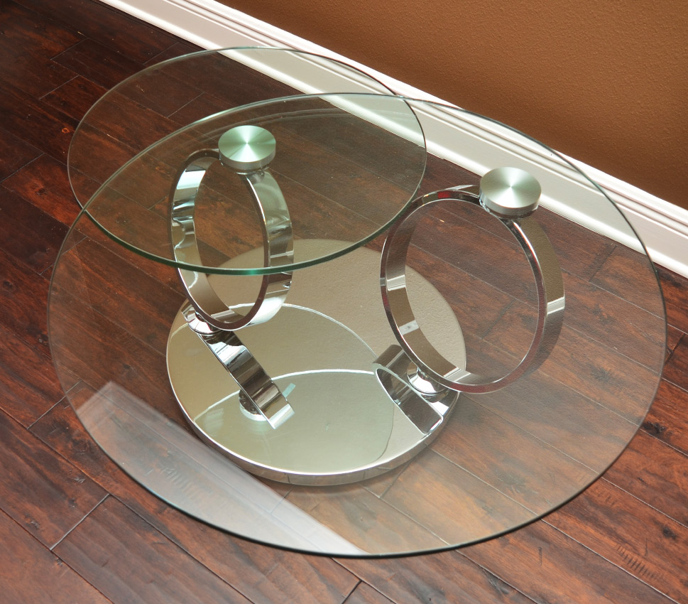 SCAN DESIGN GLASS COFFEE TABLE & SIDE TABLE: 2 pieces total to include 1) The ''Hula'' table with 2 synchronized swivel level with glass tops, chrome body. Closed 16 1/5'' h.x 31 1/2'' dia. 2) The ''Swing'' accent table, oval glass top, chrome frame. 19'' h. x 20'' x 12''.