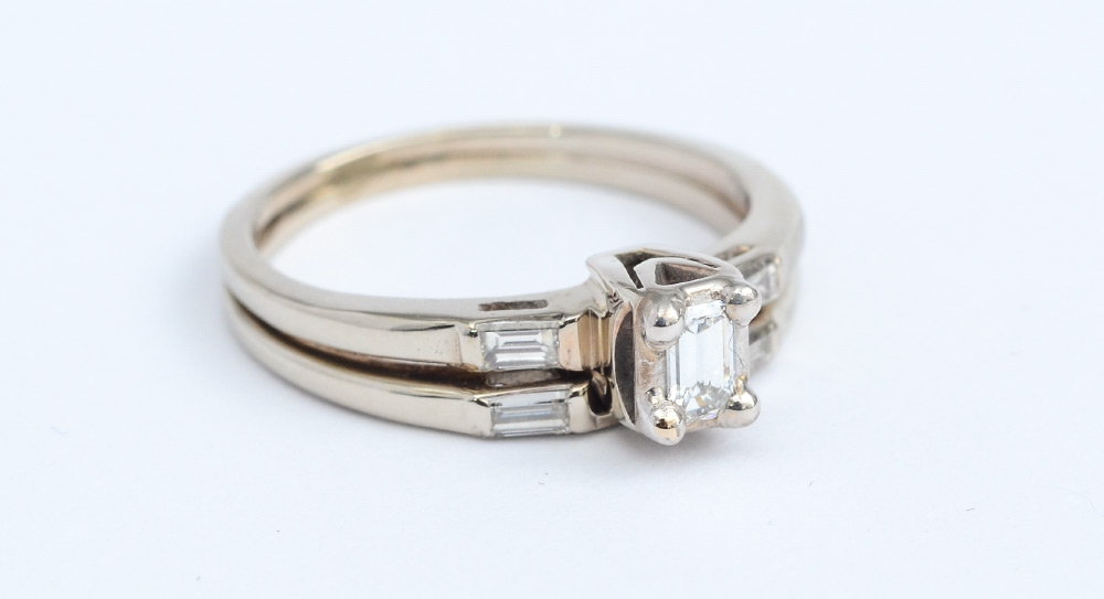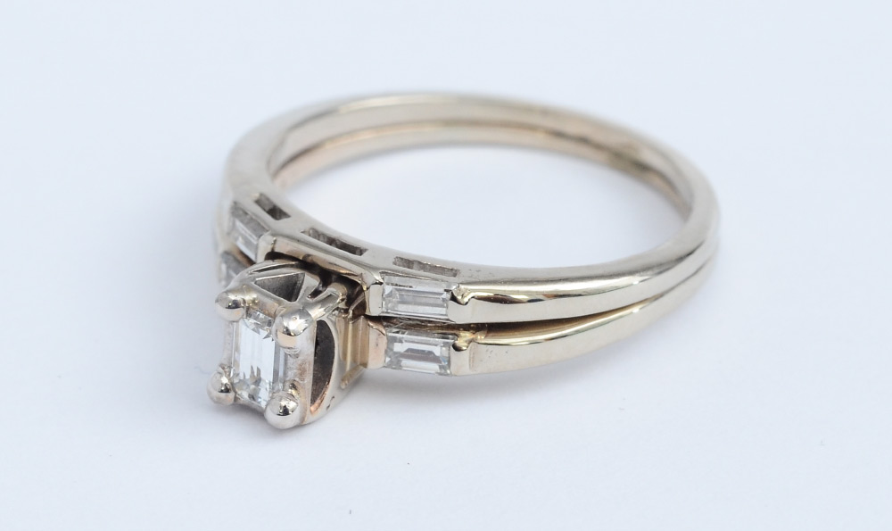 DIAMOND BRIDAL RING: 14K white gold bridal set contains one emerald cut diamond and 4 baguette cut diamonds totaling approx. .20 Ct., rated VS in clarity and G-H in color. The diamonds are prong set. The rings are joined. Weight: 3.7 grams. Size: 7