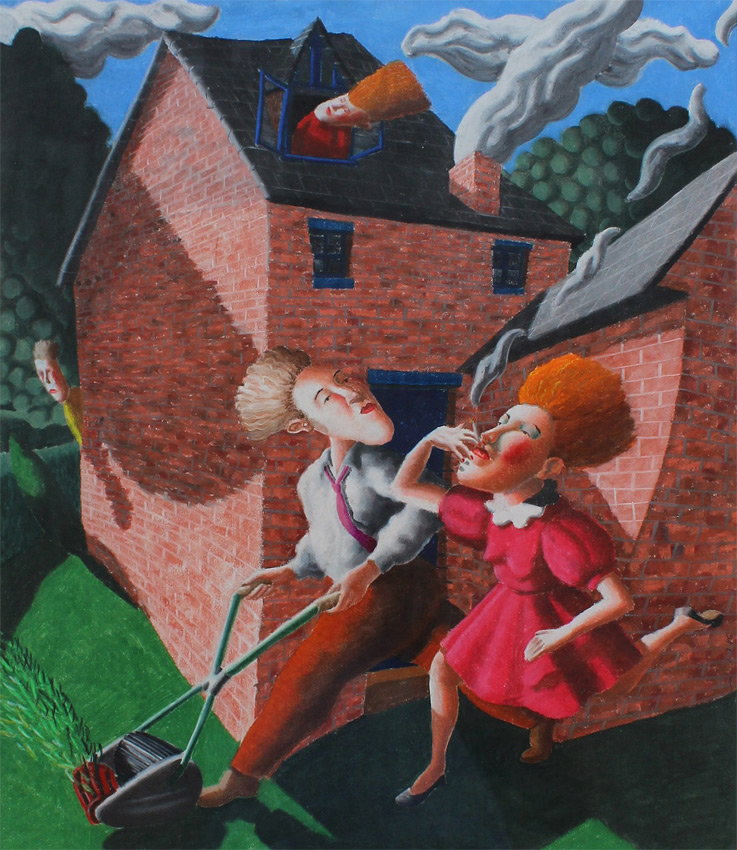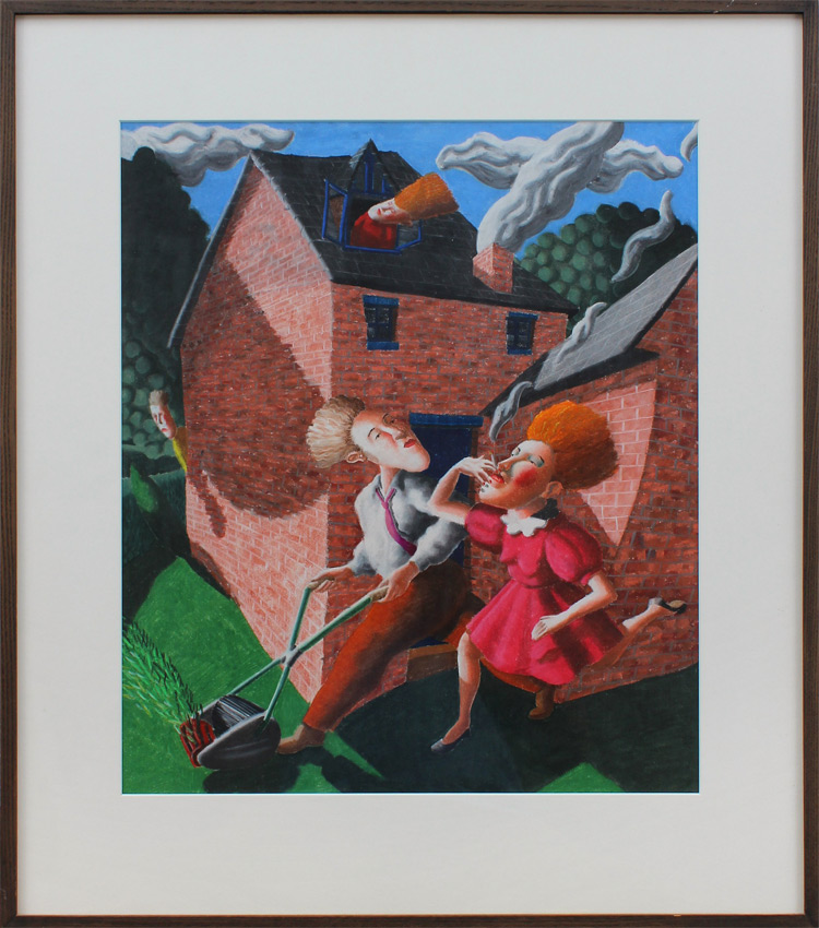 ADAMS, Richard, (British, 20th/21st Century): Fantasy/Surreal Suburban Landscape with Couple Mowing Lawn and Smoking and Several Other Figures, Pastel, sight size 21 1/2'' x 18 3/4'', signed lower right and dated 1986, framed, 30 1/2'' x 26 3/4''.
