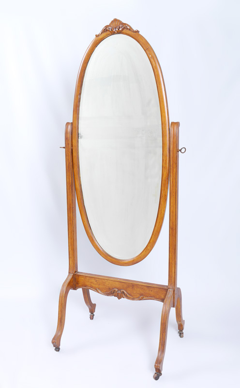 VICTORIAN CHEVAL MIRROR: Beveled oval mirror, frame with carved crest. Stand with carved stretcher, shaped legs on castors. Overall 70 1/2'' h. x 26'' x 19 1/4''.