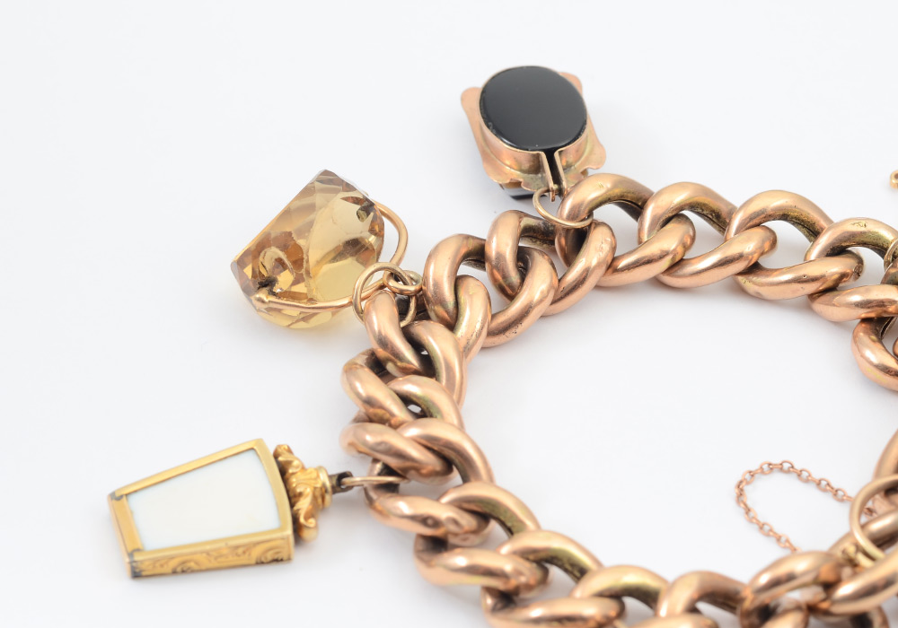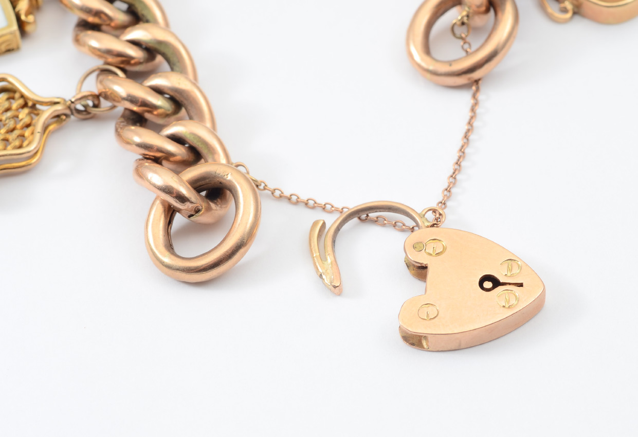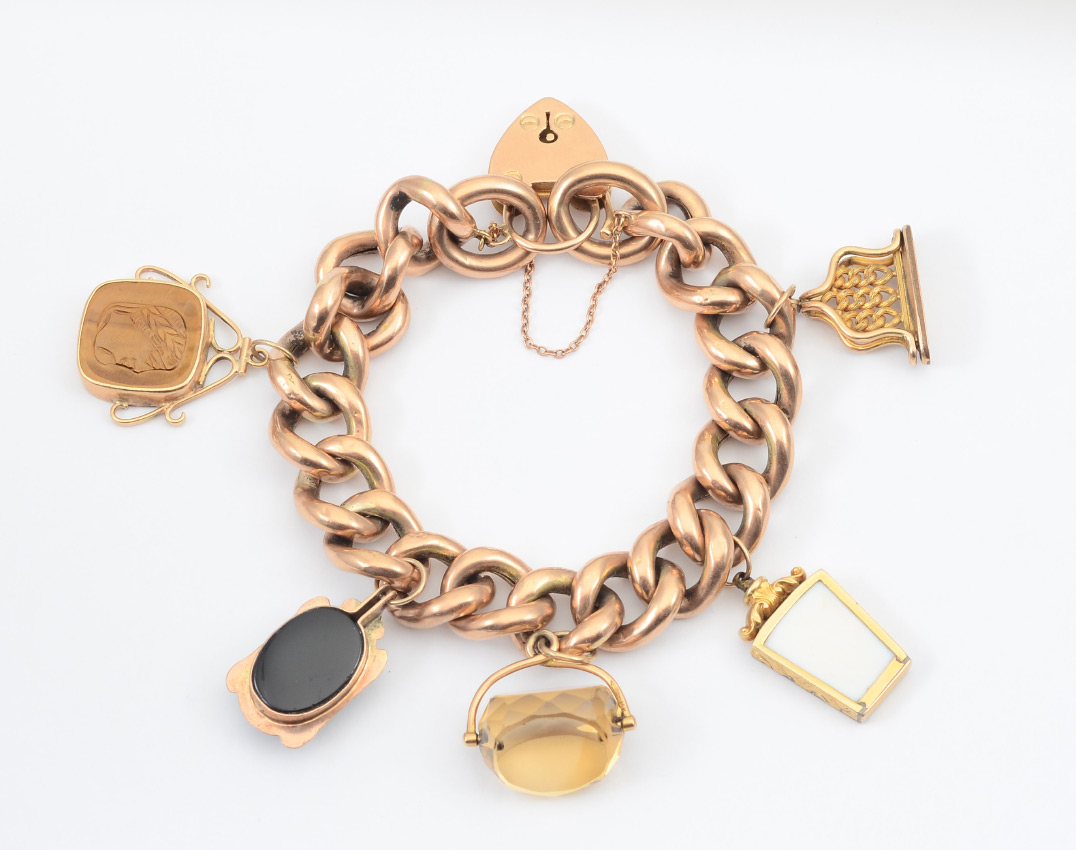 ANTIQUE BRACELET WITH FOB CHARMS: 9K yellow gold link bracelet with five 9K and gold filled fob charms. Lock clasp. Length 7''. Weight: 45.2 grams.