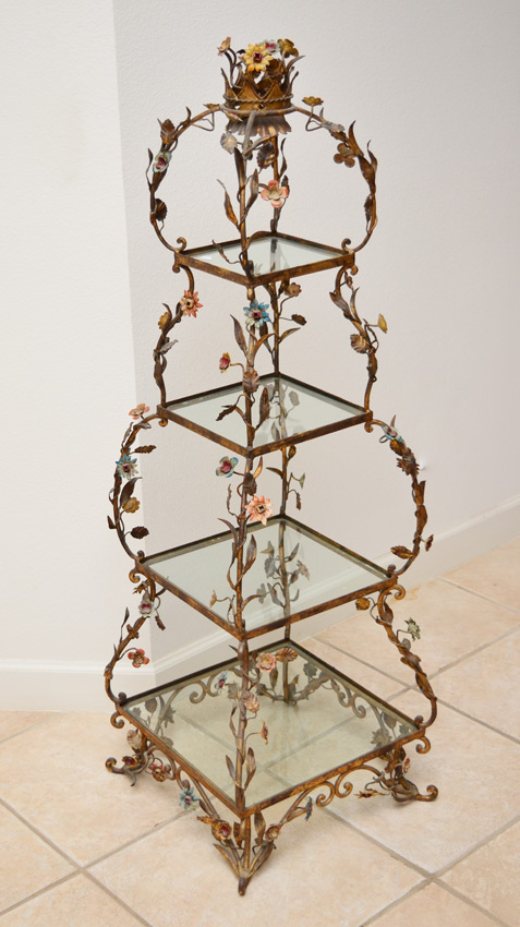 FLORAL CAST METAL ETAGERE OPEN DISPLAY STAND: Floral motif cast metal with gilt and paint decoration, 4 graduating glass shelves, overall measures 51'' h. x 17 1/2'' x 17 1/2''.