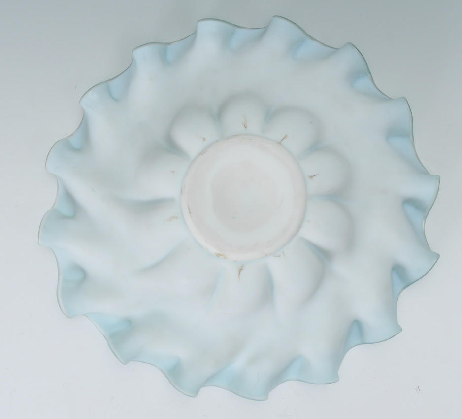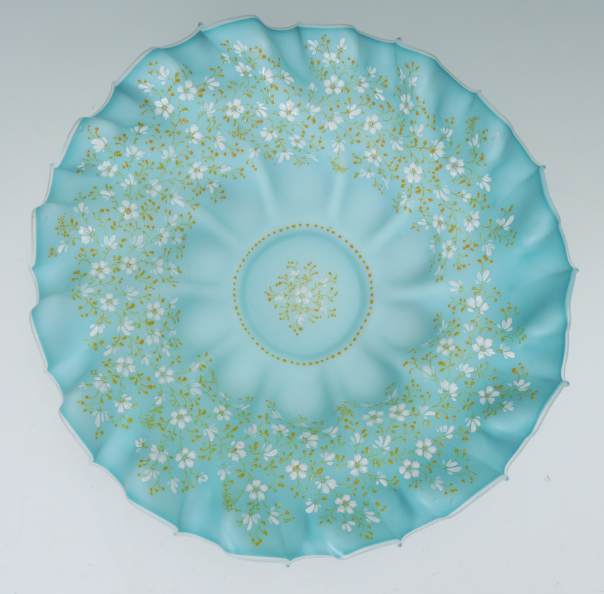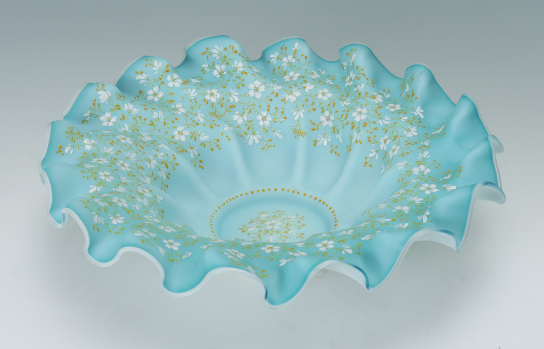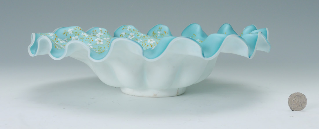 VICTORIAN ART GLASS BRIDES BOWL: Blue and white glass with ruffled rim, enameled floral decoration. 4'' h. x 14''.