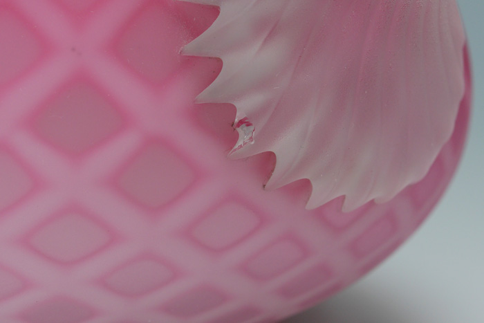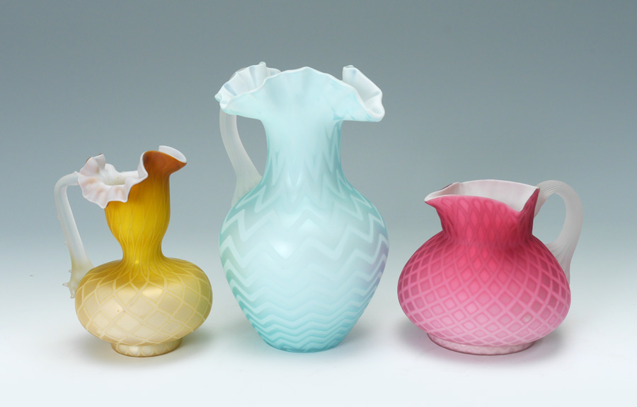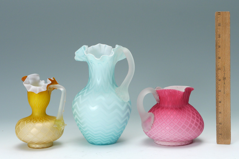 3 PIECE DIAMOND QUILTED SATIN ART GLASS: 1) Blue herringbone, 9.5''. 2) Pink diamond quilted squat pitcher, 5'' tall x 6 1/4'' at the widest. 3) Yellow diamond quilted pitcher, 6 1/2'' tall.