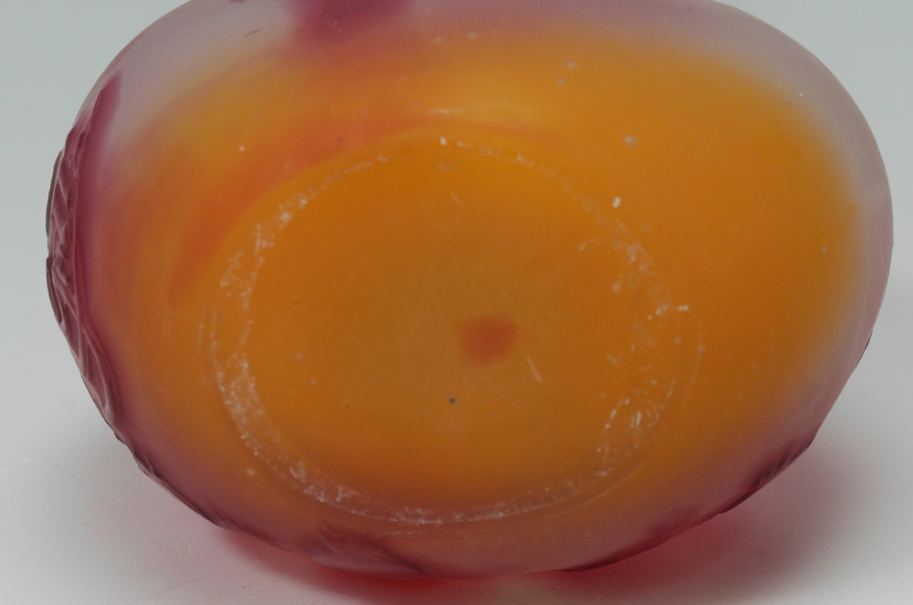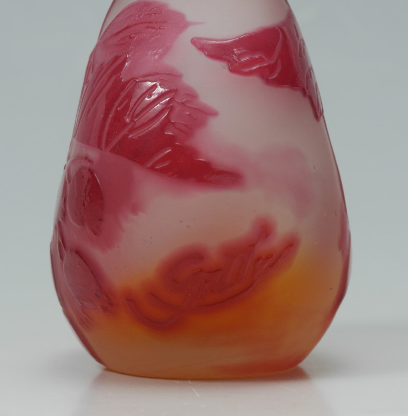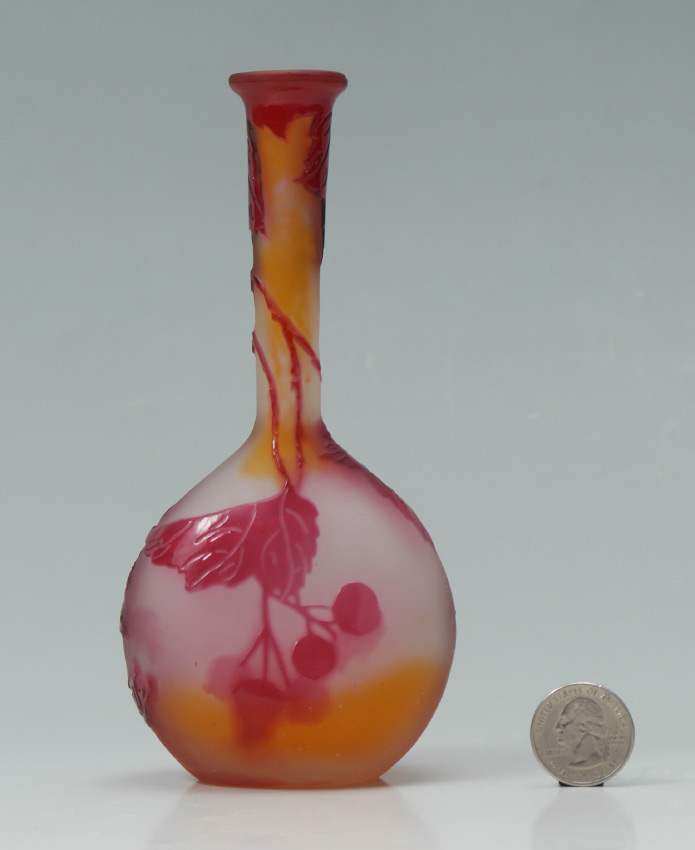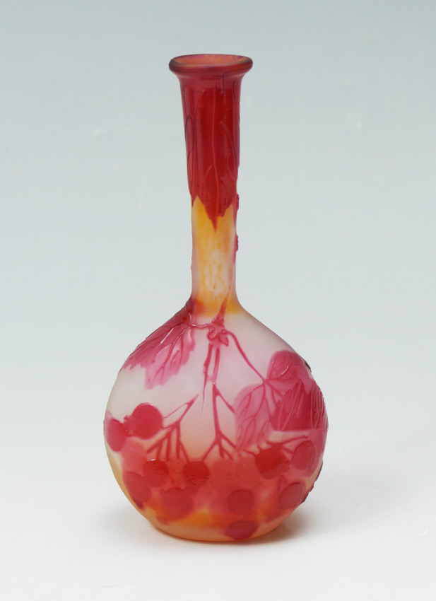 CAMEO GLASS BERRY MOTIF VASE SIGNED GALLE: Flared rim with stretched neck, red branch and berries motif on pink and orange ground, spuriously signed Galle. 6 5/8'' h. x 3 1/4''.