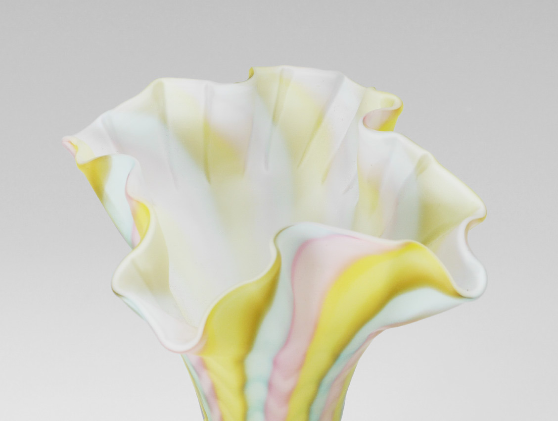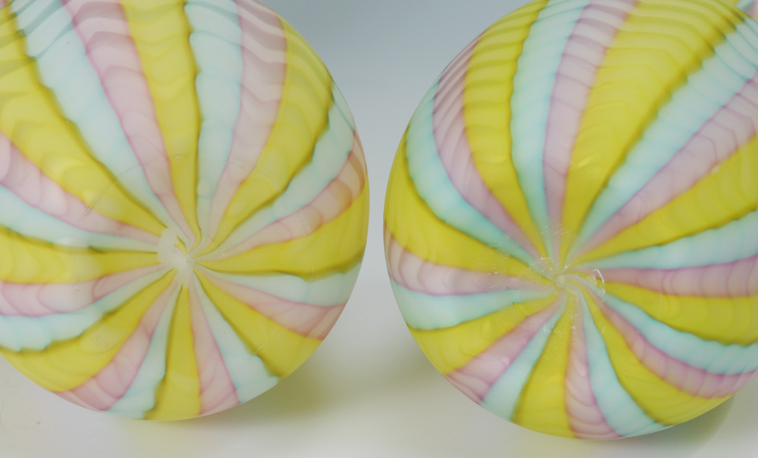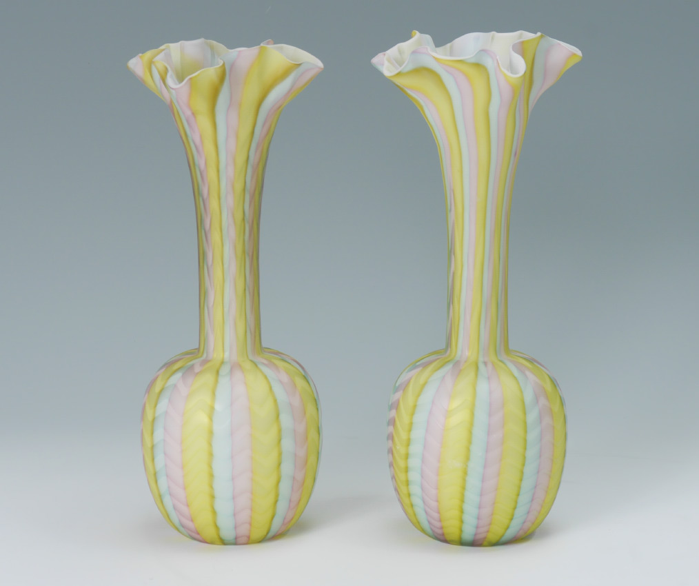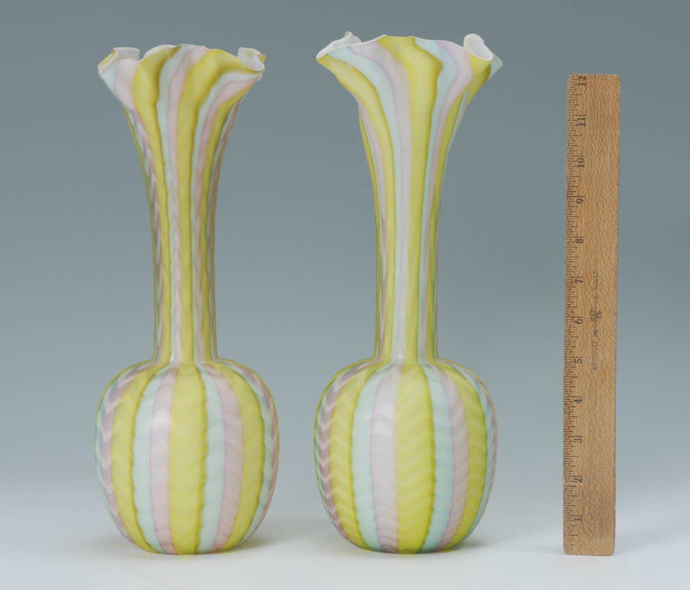 PAIR RAINBOW HERRINGBONE SATIN GLASS VASES: Long neck with ruffle rim. Measures 12.5'' x 5''.