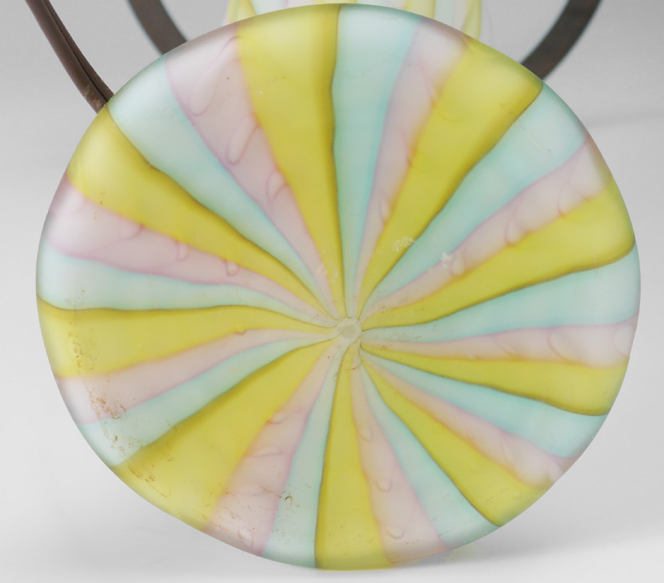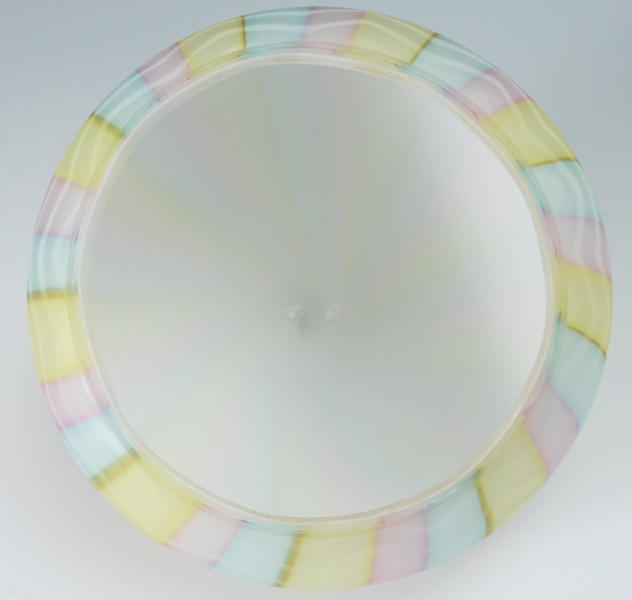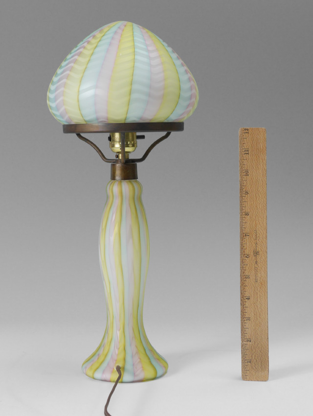 RAINBOW HERRINGBONE SATIN GLASS LAMP: Original mushroom shaped shade. Lamp measures approx. 17 1/2'' tall, the fitter rim is 5 1/2''.