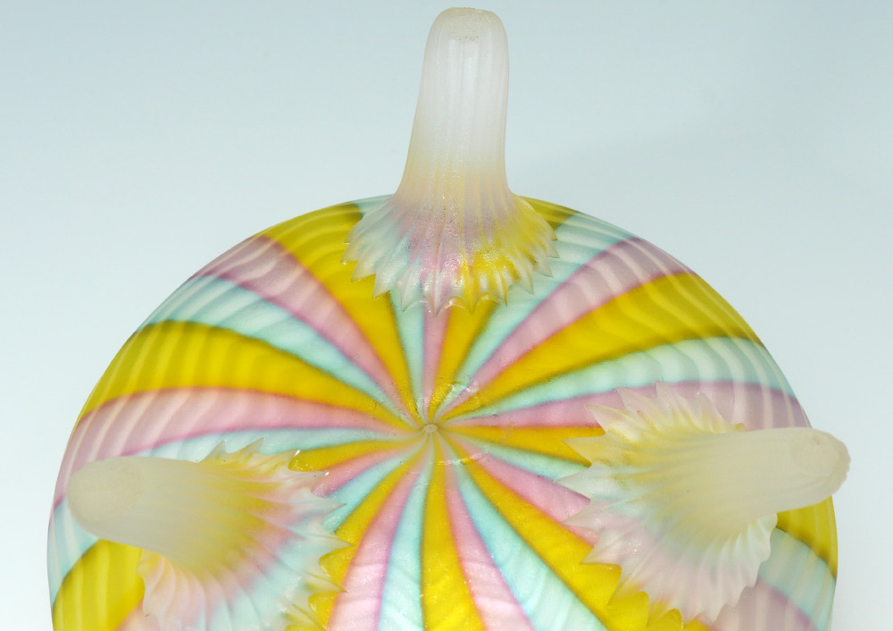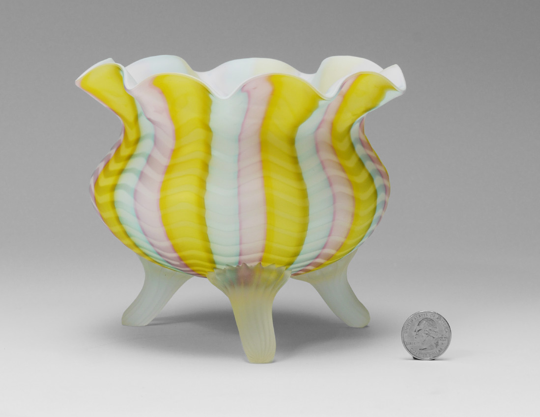 RAINBOW HERRINGBONE SATIN GLASS TRI FOOTED JARDINIERE: Large bowl with a trio of applied frosted satin glass feet. Measures approx. 5 1/4'' tall x 6 1/2'' dia.