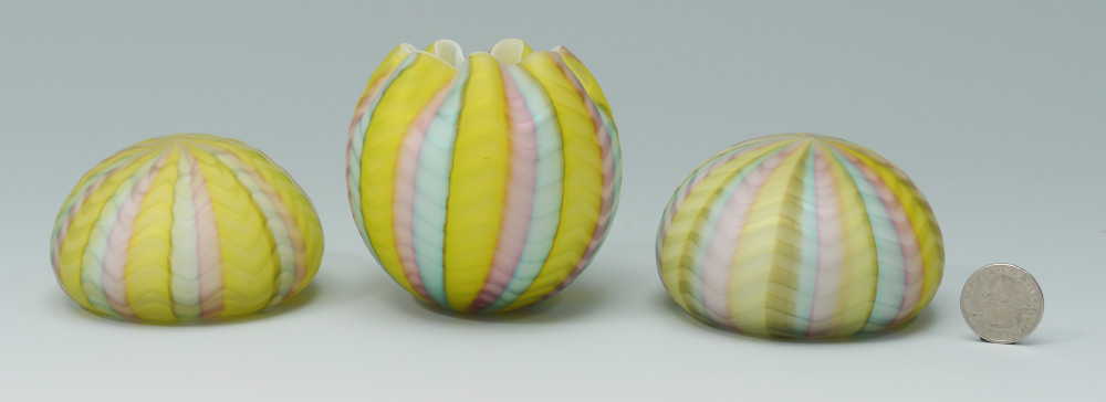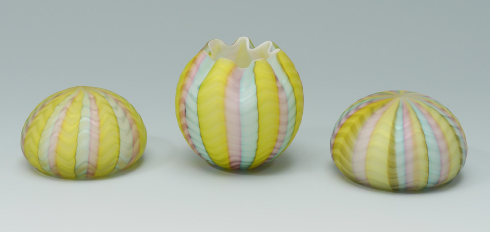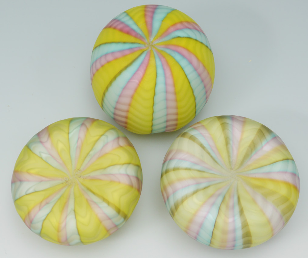 RAINBOW HERRINGBONE SATIN GLASS PAPERWEIGHTS AND ROSE BOWL: Two paperweights, 3.5'' and 3.25'', and a small rosebowl, 3'' tall.