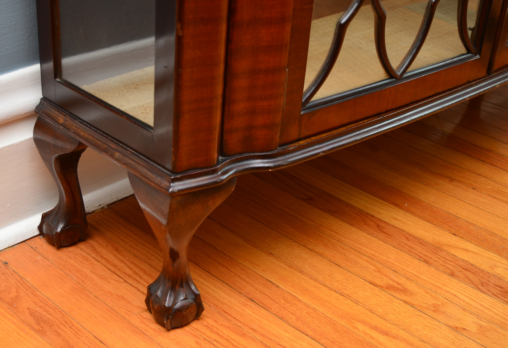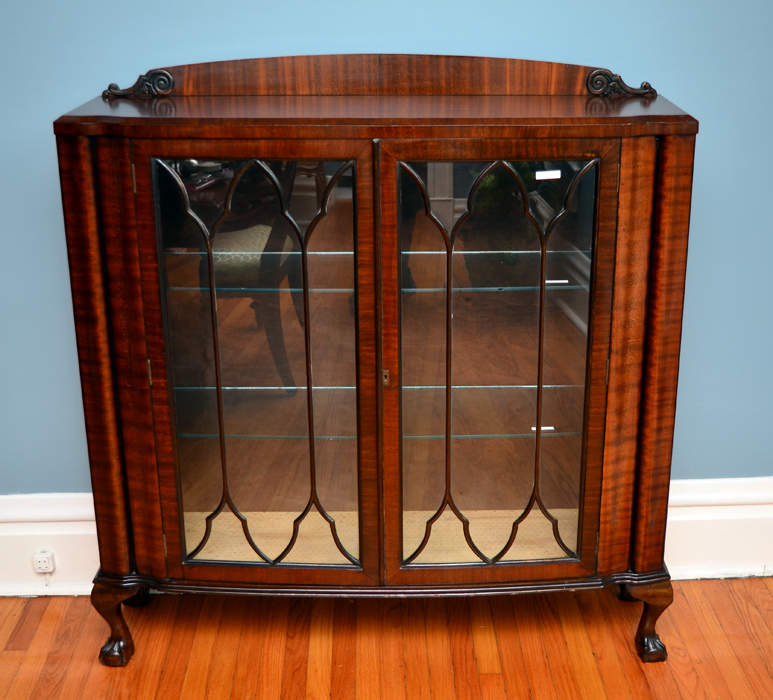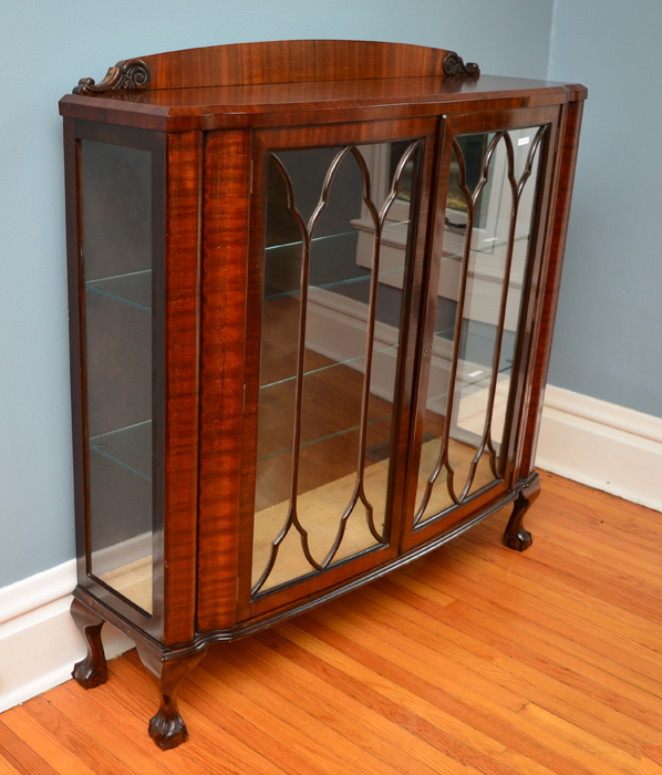 ART DECO ERA BOWED GLASS CHINA CURIO: Carved wood gallery over slightly bowed front, 2 glass doors with fretwork, glass sides, all on carved feet. Illuminated interior, 2 glass shelves, overall 49 1/2'' h. x 47'' x 13 1/2''.