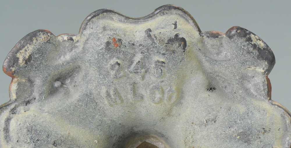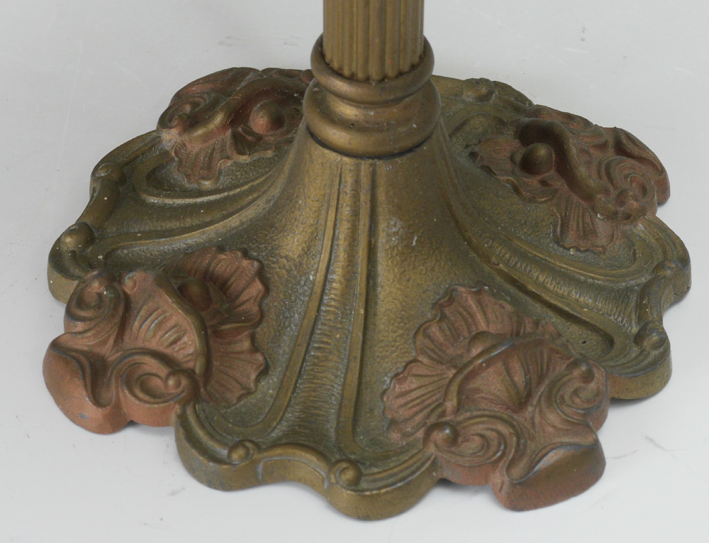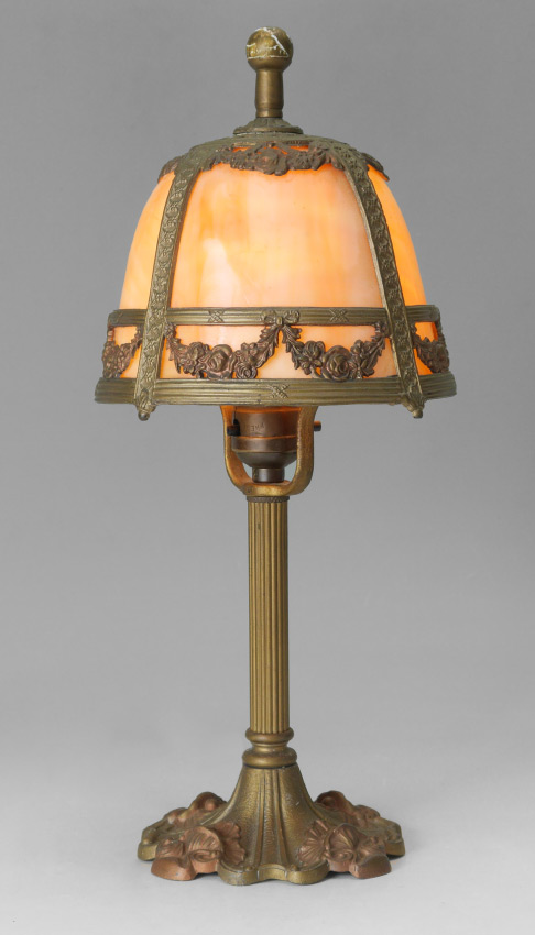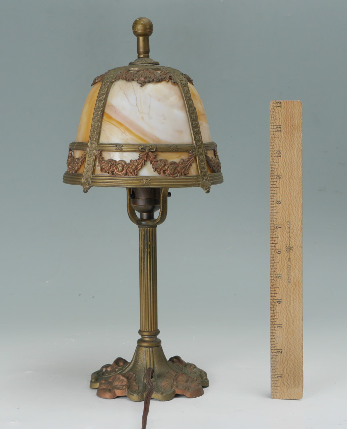 MILLER CARAMEL SLAG GLASS BOUDOIR LAMP: Cast metal foliate motif base with fluted body, marked MLC 245, 4 bent panel slag glass shade with floral swags on frame. Single light fixture, overall measures 15 1/2'' h. x 6 1/2'' dia.