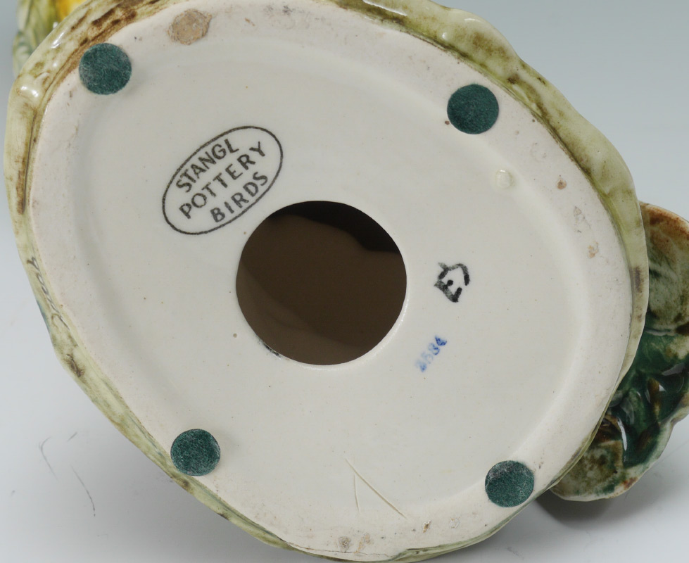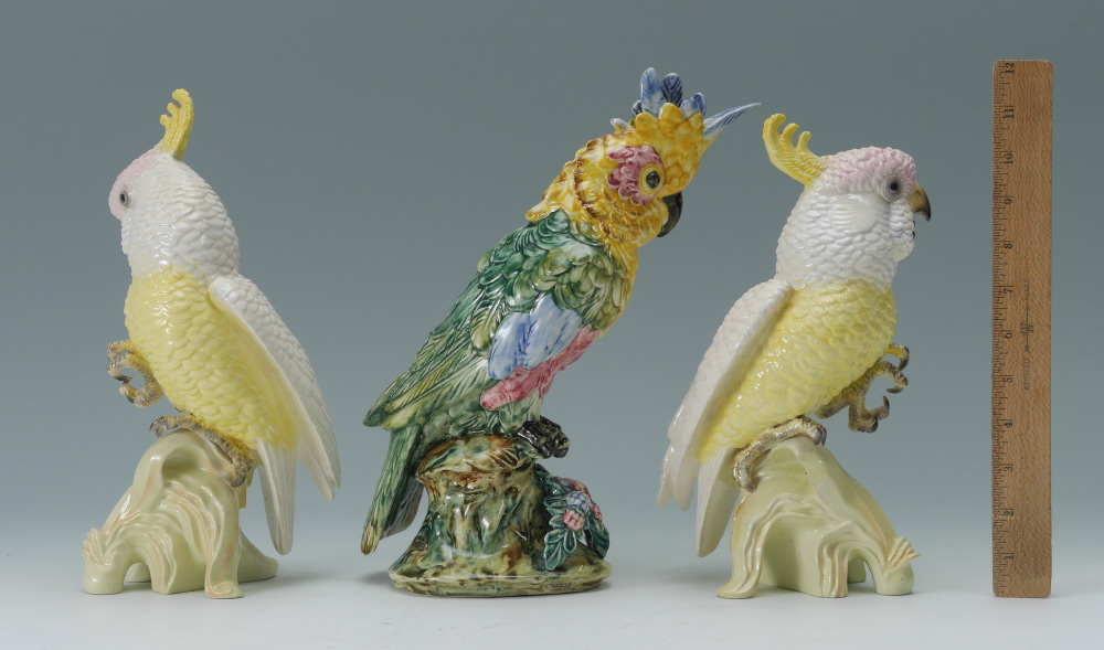 3 POTTERY BIRD FIGURINES STANGL & BALL BROTHERS: 3 figurines total to include 1) Stangl pottery parrot, marked on base 12 3/4'' x 8 1/2''. 2-3) Pair of Ball Brothers cockatiels, each 10 3/4'' h. x 6 1/4''.