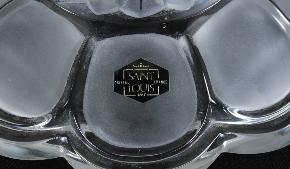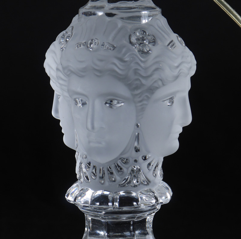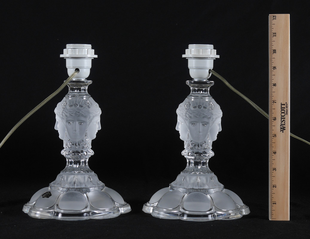 PAIR SAINT LOUIS FRENCH CRYSTAL LAMPS: Four Grecian goddess faces representing the four seasons. Scalloped base bearing Saint Louis label. Pleated silk shades. Glass measures approx. 9'' tall, lamps 19'' overall.