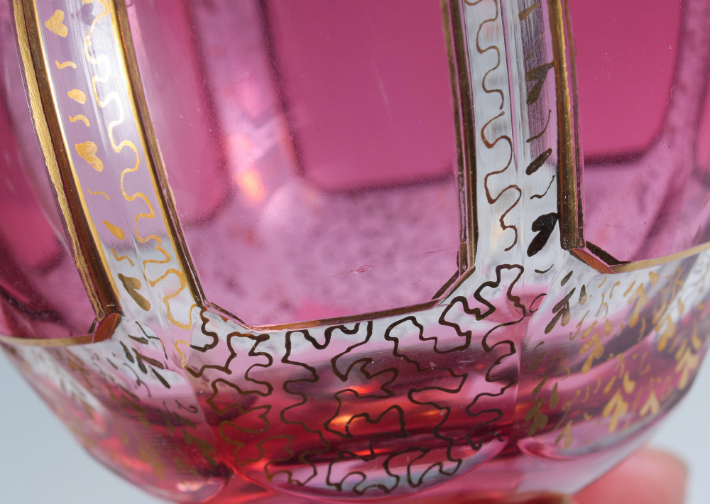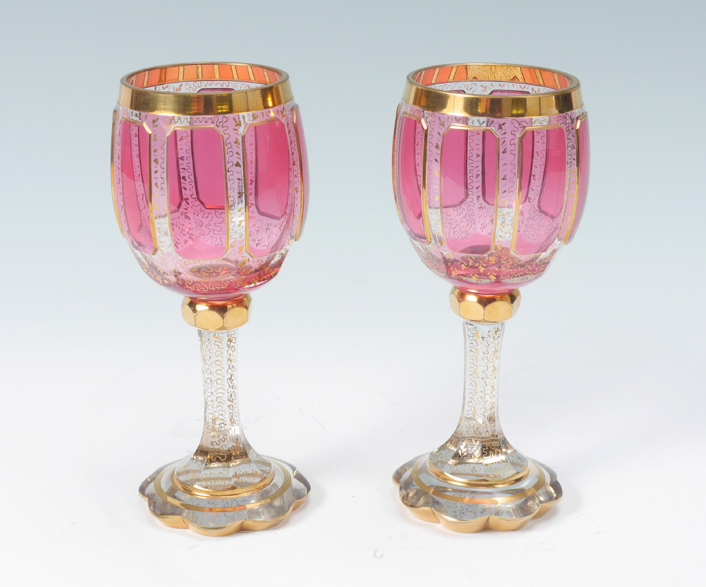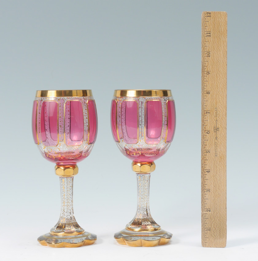 PAIR OF 2 MOSER GOBLETS: Classic gold gilding with cranberry panels and scalloped base. 8'' tall.