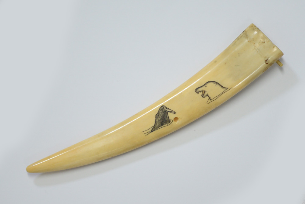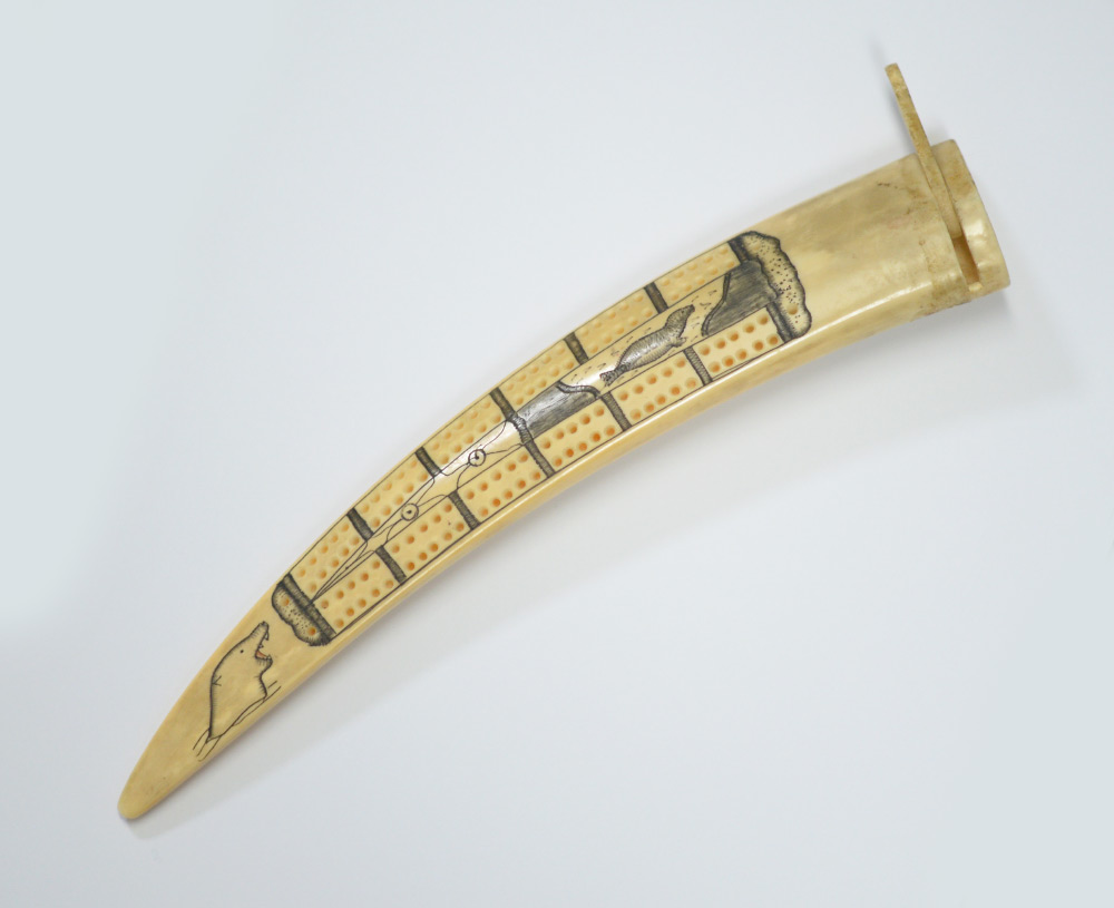 WALRUS TUSK CRIBBAGE BOARD: Scrimshaw with seal and walrus motif decoration, unsigned. Pre-1950 walrus tusk, not subject to CITES in the US. 9'' long.