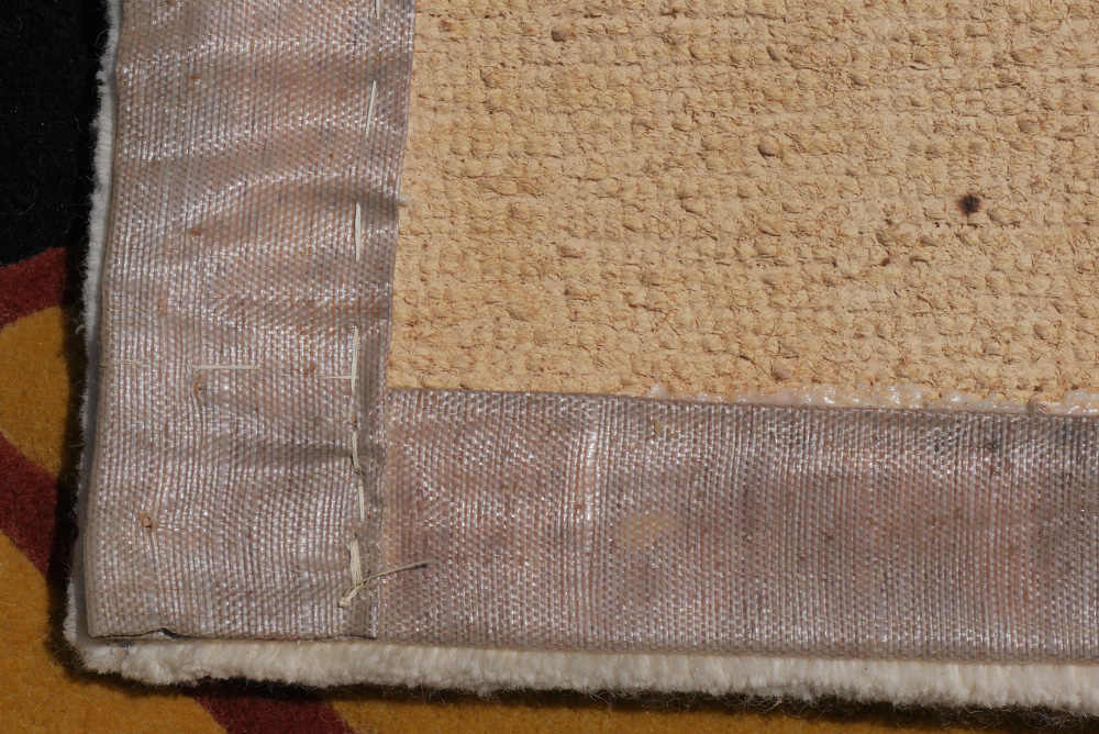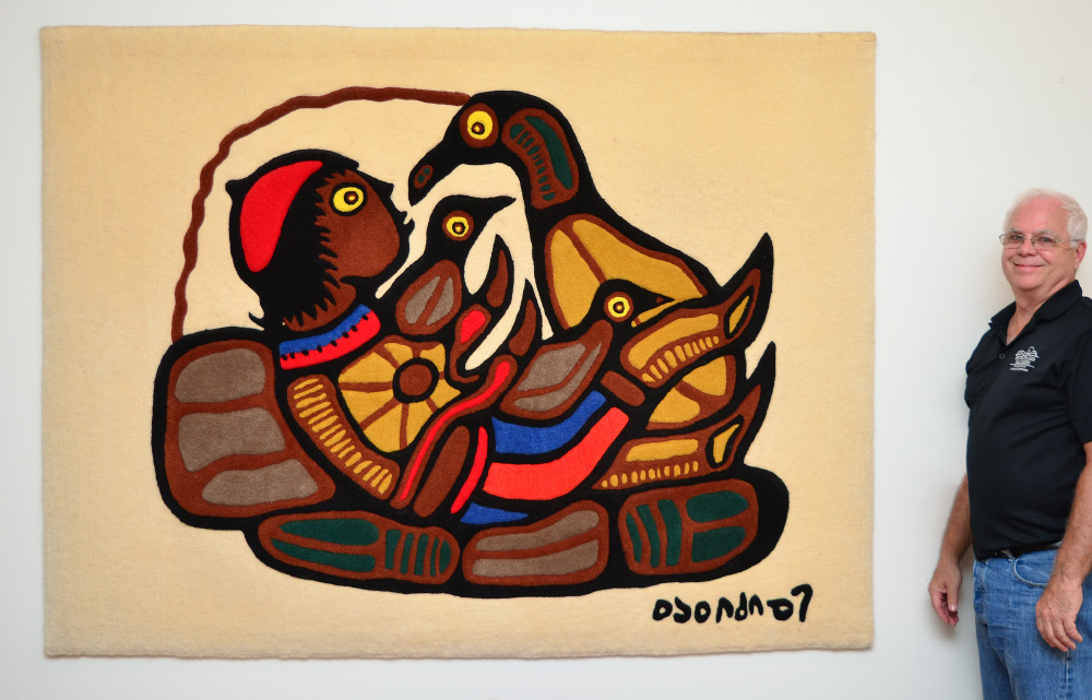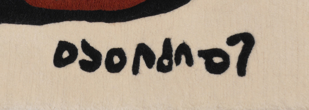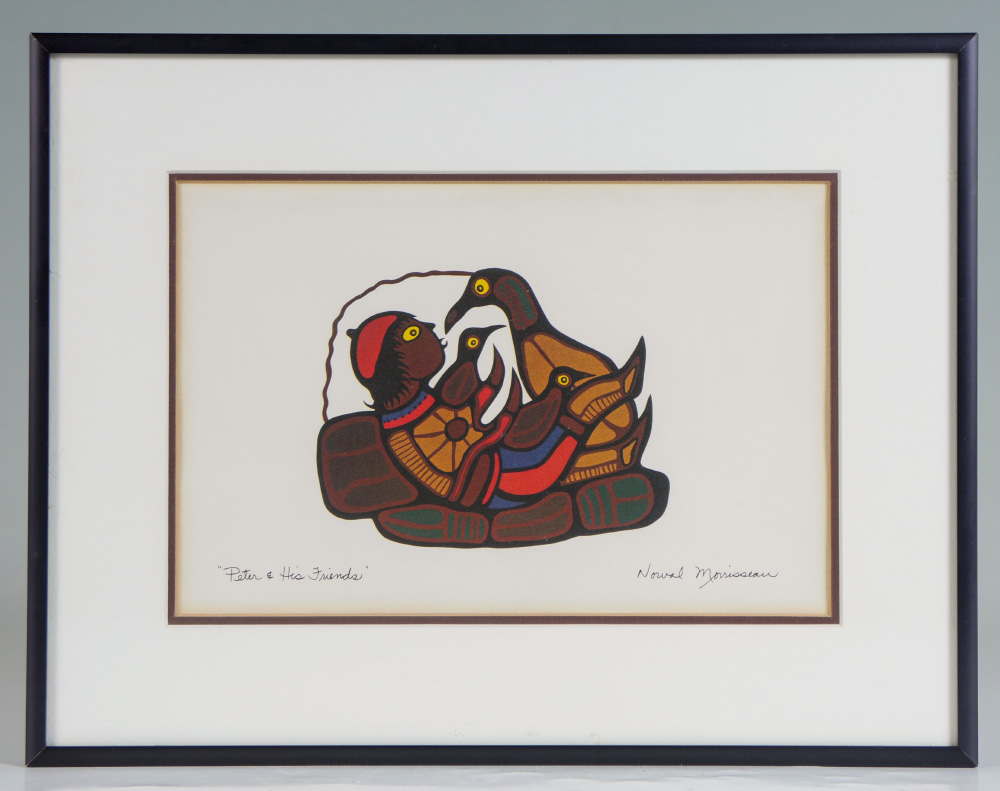 MORRISSEAU, Norval, (Copper Thunderbird) (Ojibway / Canadian, 1931-2007) After: ''Peter and His Friends'', Woven Tapestry / Wall Hanging / Rug, 5'1'' x 6'8'', Cree syllabics signature lower right in the weave. Pocket for hanging on the back top. Sold with a double matted framed print of the painting on which the rug is based, sight size 5.75'' x 8.75'', artist bio on back, Calgary Alberta Canada shop label verso, contemporary frame 9.75'' x 11.75''.