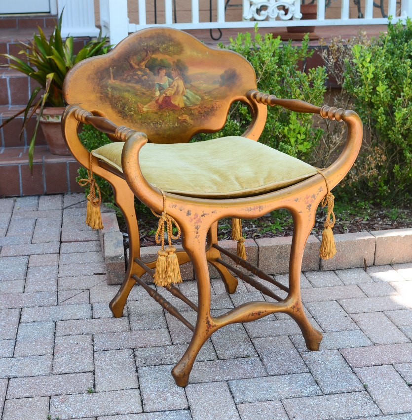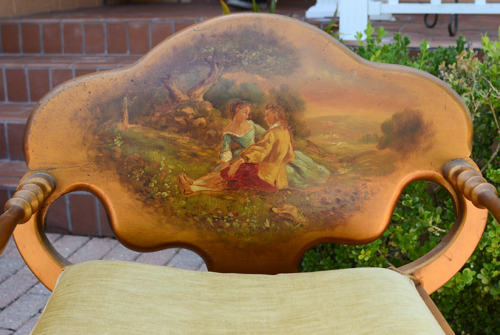 VERNIS MARTIN STYLE PAINT DECORATED SIDE CHAIR: Gilt painted all over, shaped back with hand painted outdoor genre scene of 2 lovers, turned arms, barrel style seat, front supports with floral designs, shaped legs, turned stretchers. Overall measures 30 1/4'' h. x 23 3/4'' x 20 3/4''.
