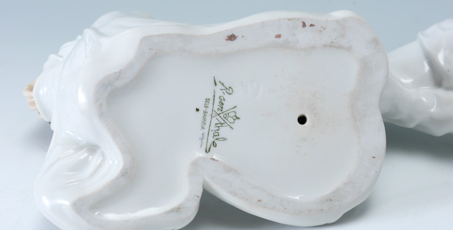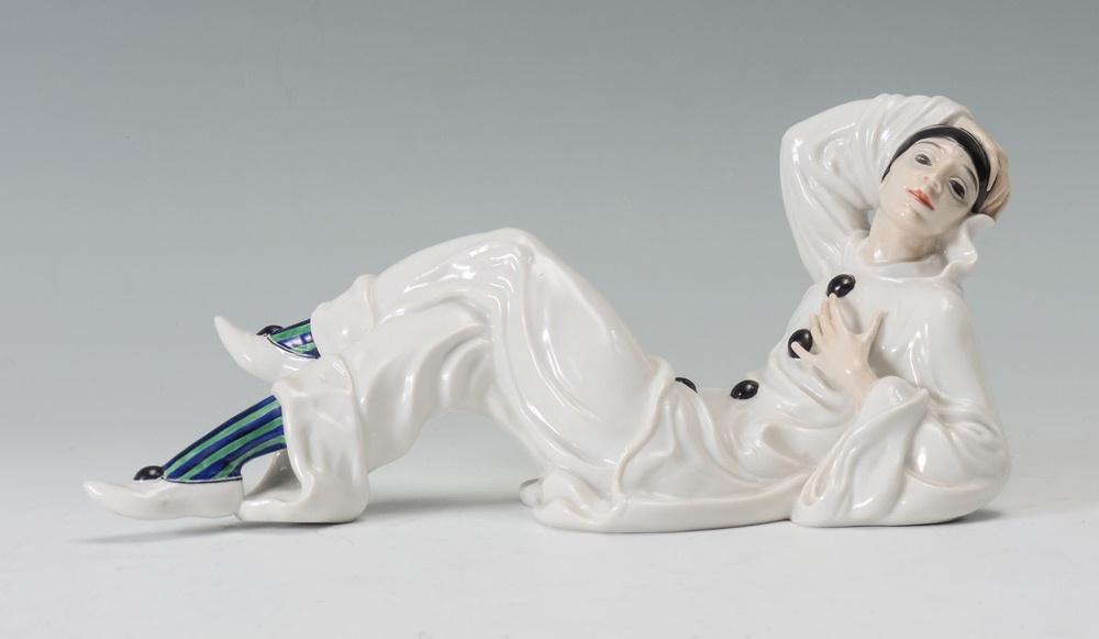 ROSENTHAL PIERROT PORCELAIN CLOWN FIGURINE: Reclining figure of Pierrot clown, black hat and buttons, blue and green striped socks. Green Rosenthal mark, signed by the artist Wilhelm under mark. Overall measures 5 1/4'' h. x 12''.