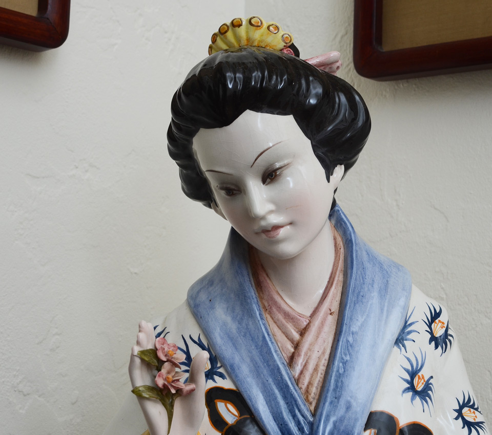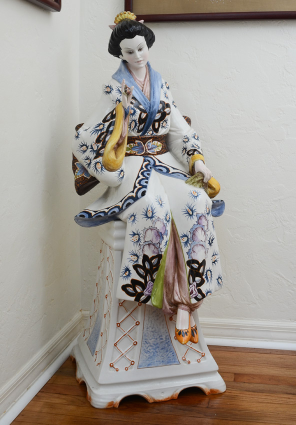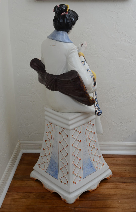 LARGE ORIENTAL PORCELAIN SEATED WOMAN FIGURE: Polychrome decorated figure of a seated geisha wearing a kimono, flowers in right hand, cloth in left. 36 1/2'' h. x 18'' x 17''. Sits on porcelain stand with flared base, 19 1/4'' h. x 15'' x 15'', overall 42'' high together.