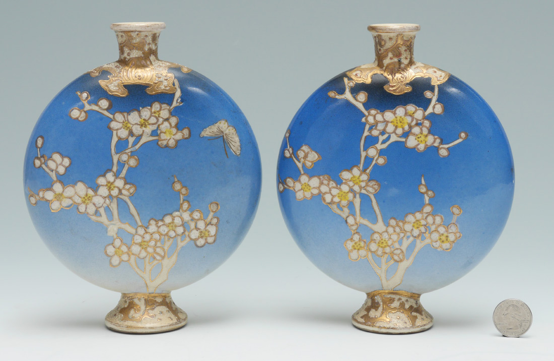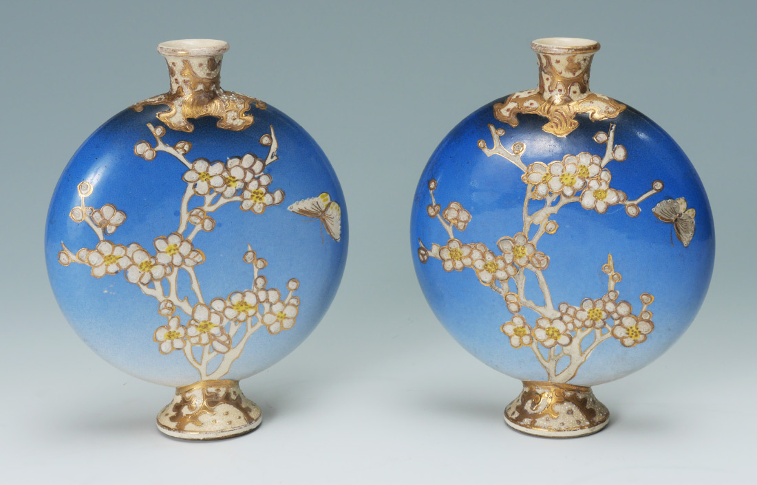 PAIR SATSUMA MOON VASES: Each having a blue body with butterfly and flowers motif, unmarked. Measures 7 1/2'' x 6''.