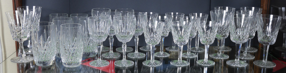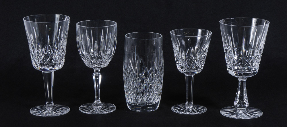 ASSEMBLED COLLECTION OF WATERFORD STEMWARE: An assembled 28 piece collection with 4 patterns to include 6 water (6 7/8''), 8 wine (5 3/4''), 6 wine (6 1/2''), 8 large tumblers (5 1/2''), 2 water (6 3/4'').