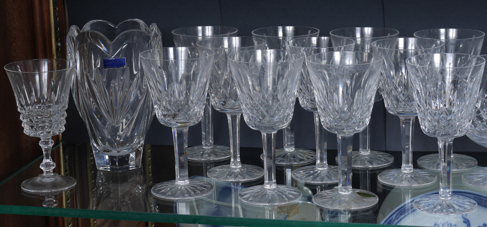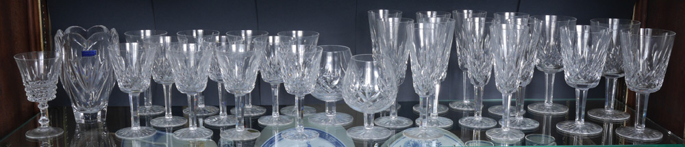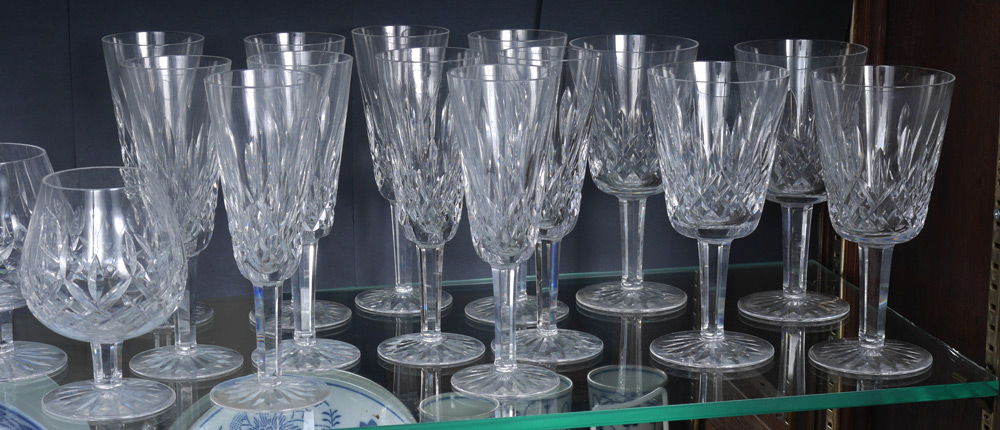 WATERFORD LISMORE CRYSTAL STEMWARE: Approx. 23 pieces in the Lismore pattern by Waterford to include 3 water (6 7/8''), 9 champagne (7 1/4''), 2 brandy (5 1/4''), 9 claret wine (5 7/8''). Sold with a Marquis vase, 6 1/2''.