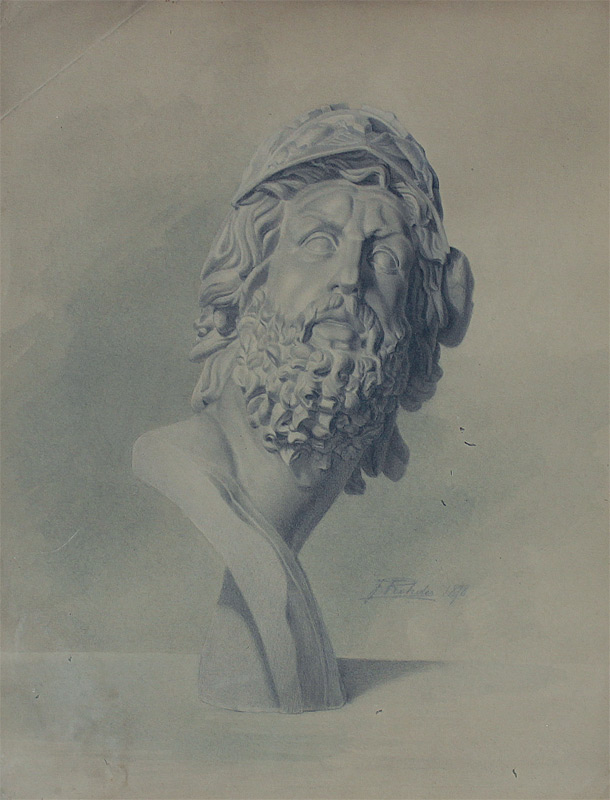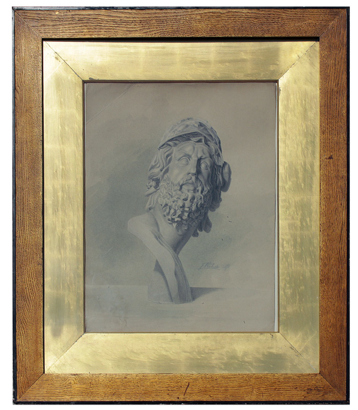 NEOCLASSICAL PENCIL DRAWING OF A ROMAN WARRIOR SIGNED REHDER: sight size 22'' x 17 1/2'', signed lower right J? Rehder and dated 1878, encased in original ebonized and gilded oak frame, 35 1/2'' x 31 1/4''.