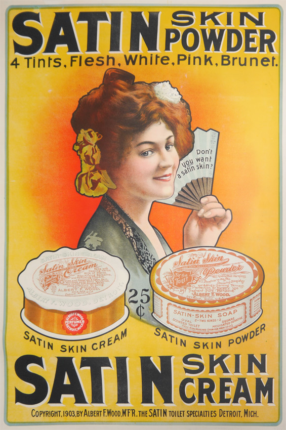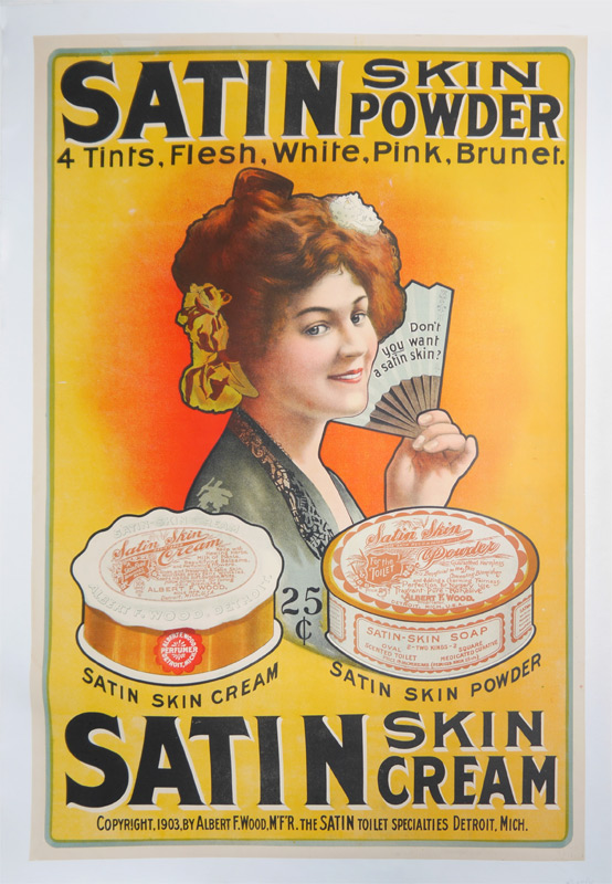 SATIN SKIN POWDER / CREAM ADVERTISING POSTER: Circa 1903, advertising for Albert F. Wood Satin Skin Cream and Powder, image of girl with fan, 41 1/2'' x 27 1/4'', backed with linen 44 1/2'' x 30 1/2''.