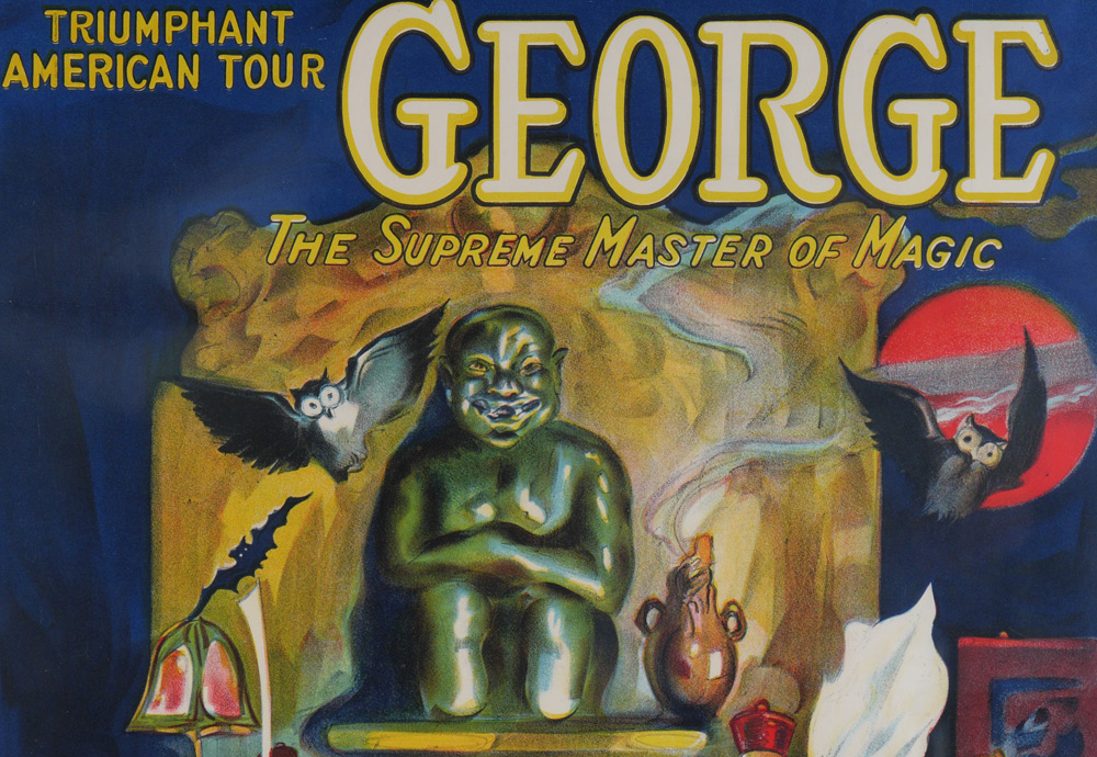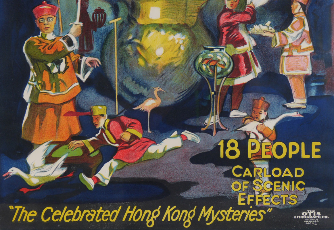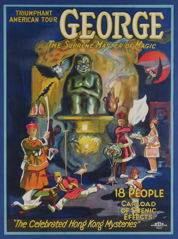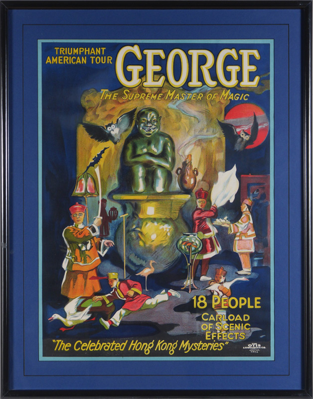 GROVER GEORGE TRIUMPHANT AMERICAN TOUR MAGIC POSTER: Advertising poster for George ''The Supreme Master of Magic'' American tour. Touted as having 18 people and a carload of special effects, ''The Celebrated Hong Kong Mysteries''. Published by The Otis Lithograph Co. Sight size 24'' x 17 3/4'', framed 30 1/4'' x 24 1/4''.