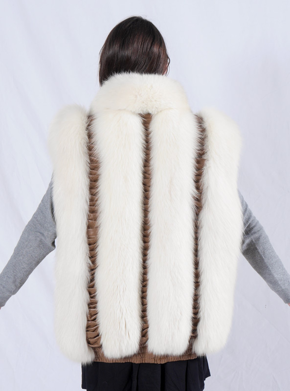 WHITE FOX FUR AND LEATHER JACKET: Car coat length jacket converts to a vest with removal of sleeves. Zipper front and sleeves. Elasticized at the hem. Size 14 measures approx. 28'' collar to hem, 20'' shoulder to shoulder and 24'' shoulder to cuff.