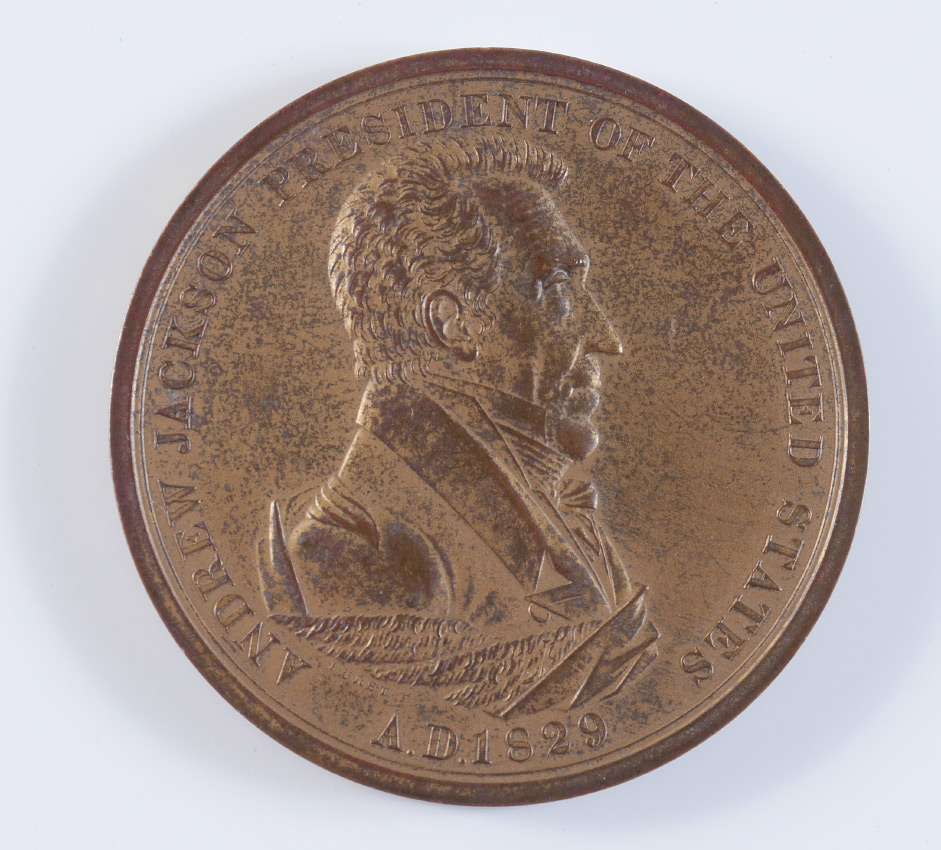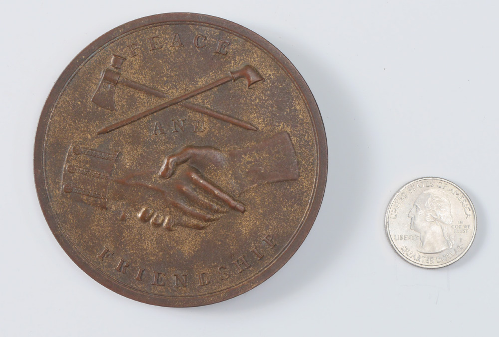 BRONZE ANDREW JACKSON INDIAN PEACE MEDAL: Large size, designed by Moritz Furst, obverse with bust of Andrew Jackson , reverse with crossed peace pipe and tomahawk, shaking hands, motto ''Peace and Friendship''. 3'' dia., ungraded.