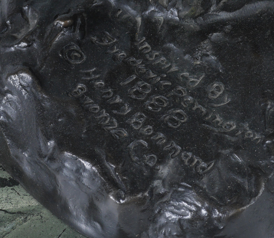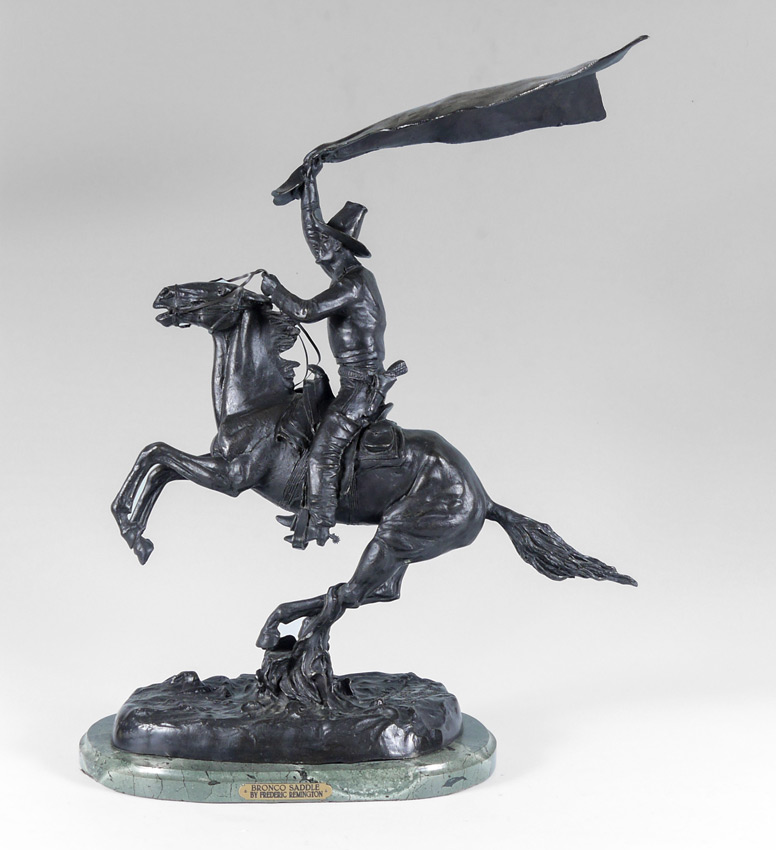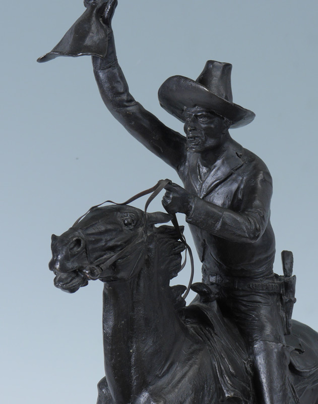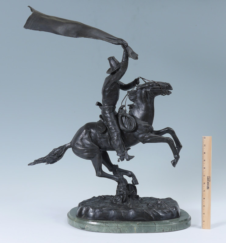 FREDERIC REMINGTON INSPIRED BONNARD BRONZE COWBOY: Figure of a cowboy riding a horse and waving a blanket, on green marble plinth. Incised on base of bronze ''Inspired by Frederic Remington, 1888, copyright symbol, Henry Bonnard Bronze Co.'', overall 29'' h. x 23 1/2'' x 10 3/4''.