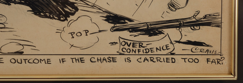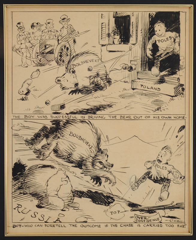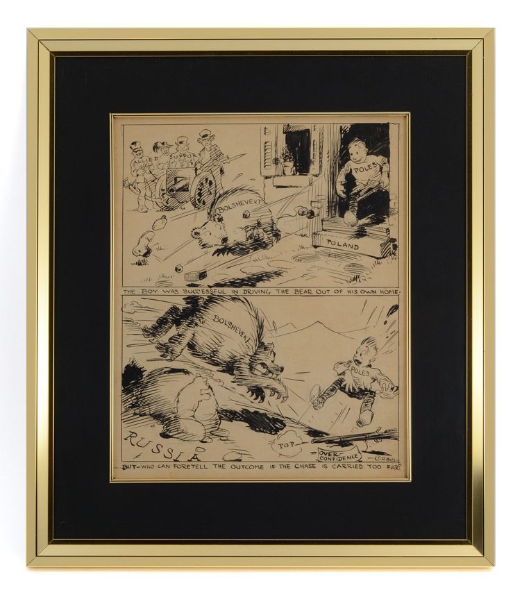 POLISH - SOVIET WAR ILLUSTRATION SIGNED CRANE: Circa 1921 political cartoon referencing the end of the Polish - Soviet War in 2 panels, pen and ink on paper, signed lower right Crane? Sight size 13'' x 10 1/2'', framed and matted 19 1/2'' x 17''.
