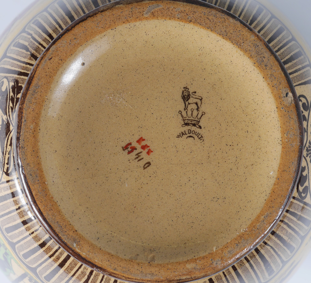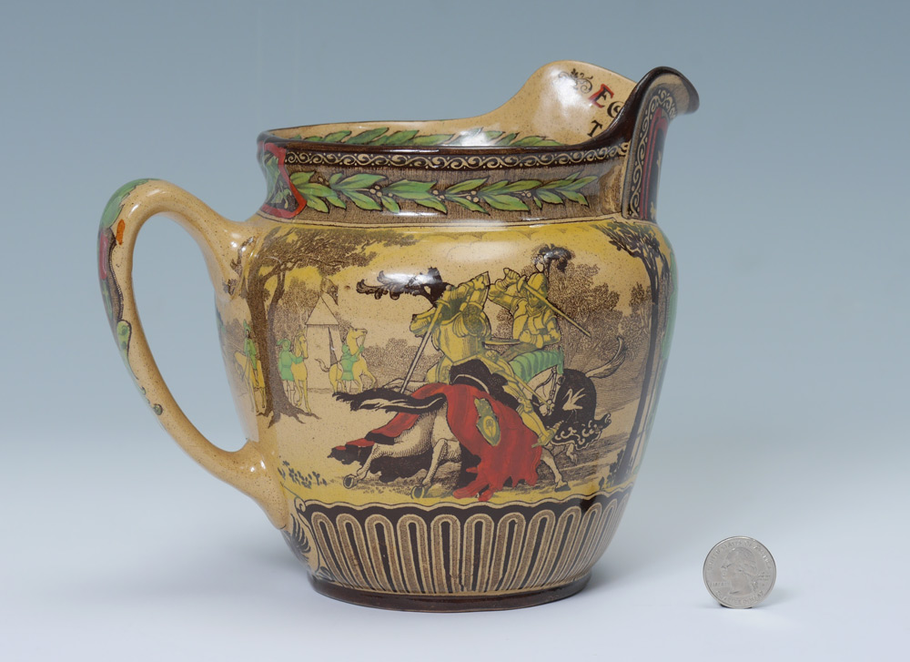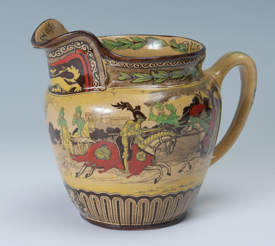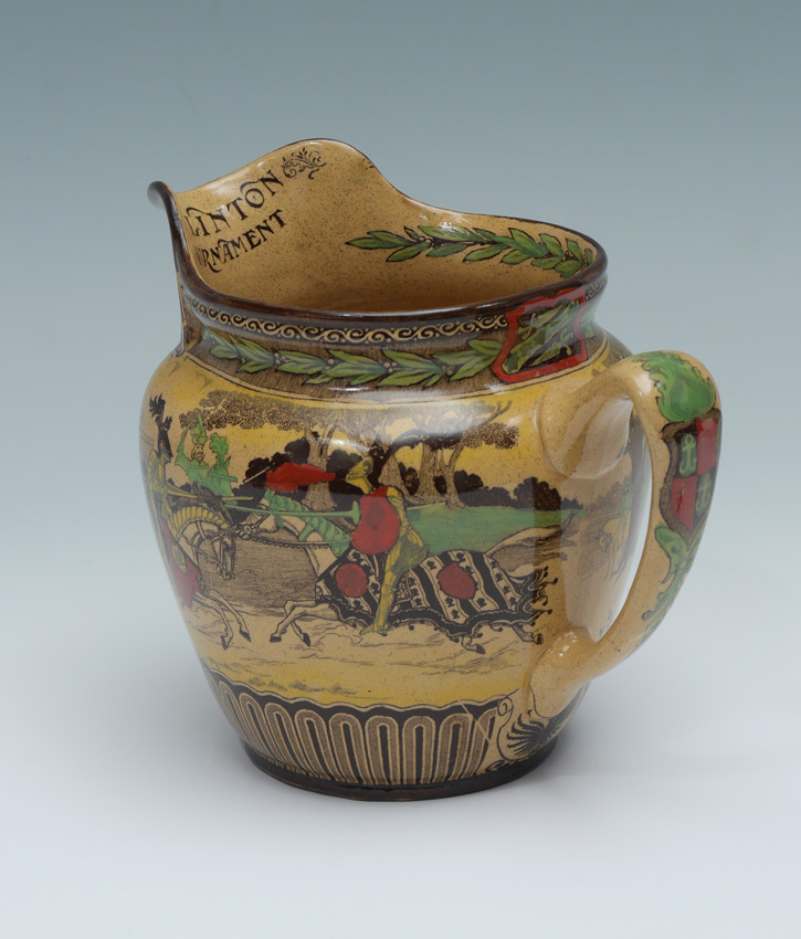 ROYAL DOULTON EGLINTON TOURNAMENT JUG: Yellow ware pitcher in a three color Doulton first introduced the Eglinton Tournament series ware in 1902 and discontinued it in 1928. The Eglinton Tournament of 1839 was a re-enactment of a medieval joust held at Eglinton castle in Scotland. Measures 7'' tall.