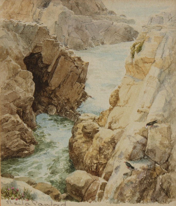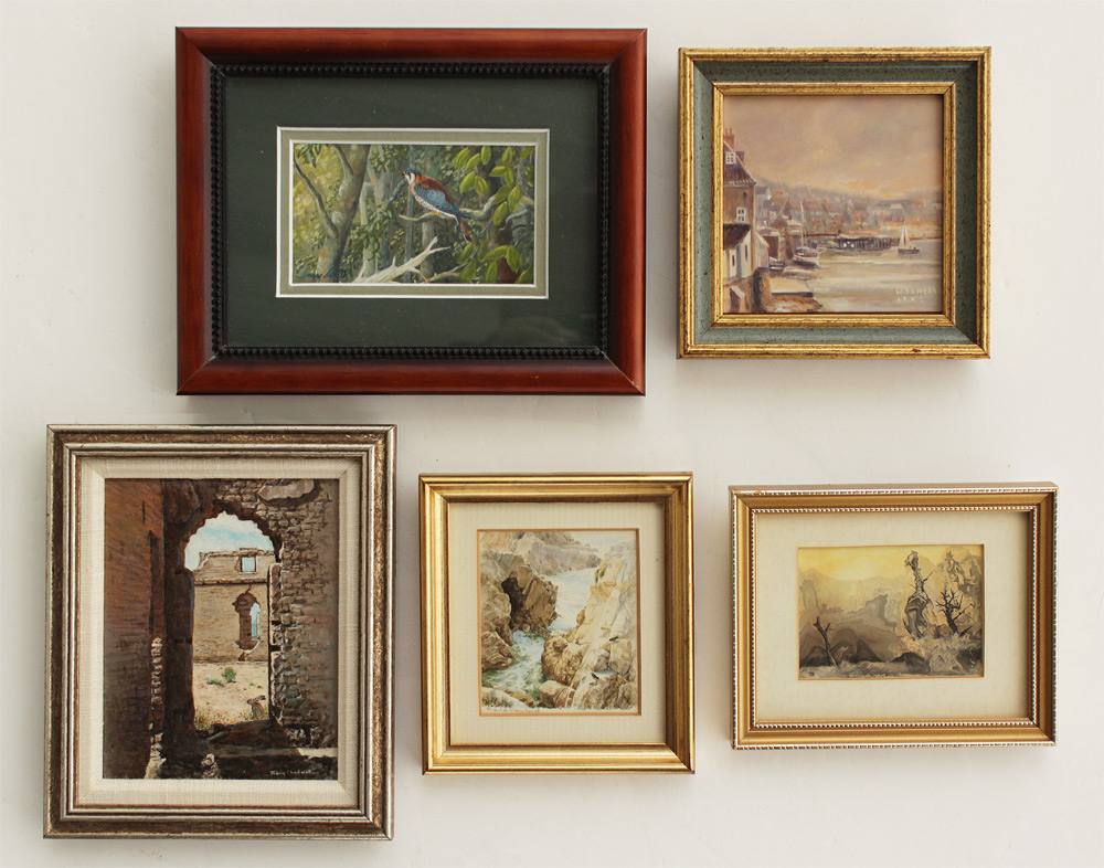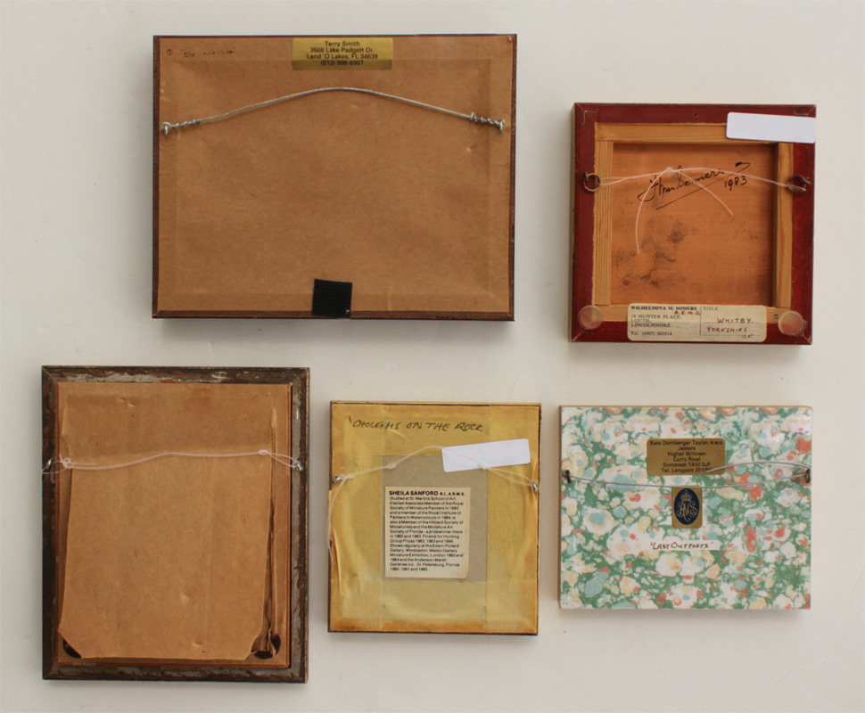 5 PC MINIATURE PAINTING LOT: To include 1) Mary Chadwell, Southwestern Ruins, Oil/Canvasboard, sight size 4 3/4'' x 3 3/4'', signed lower right, framed, 6 3/8'' x 5 1/2''; 2) Terry Smith, ''On Watch'', Gouache, sight size 2 1/4'' x 3 3/4'', signed lower left, framed, 5 5/8'' x 7 1/4''; 3) Sheila Sanford, ''Choughs on the Rock'', Watercolor, sight size 2 3/4'' x 2 1/2'', signed lower left, framed, 4 3/4'' x 4 1/4''; 4) Kate Dornberger Taylor, R.M.S., ''Last Outpost'', Watercolor, sight size 2'' x 2 3/4'', monogrammed lower left, framed, 4'' x 5''; 2) Wilhelmina Somers, ''Whitby Yorkshire'', Oil/Copper, sight size 3 1/4'' x 3 3/8'', signed lower right, signed and dated 1983 verso, titled on the label verso, framed, 4 3/4'' x 4 3/4''.