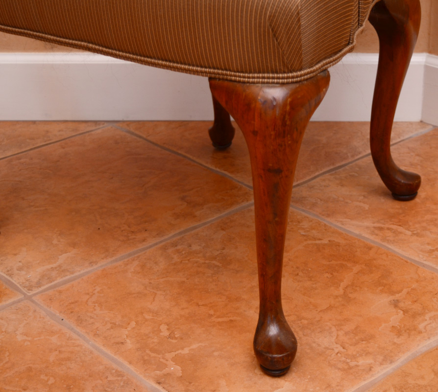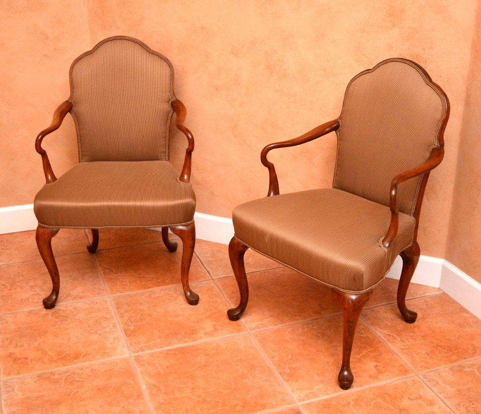 PAIR FRENCH STYLE SCROLL ARMCHAIRS: Bent wood and shaped back, arms and legs, striped tan upholstery. Overall measures 40'' h. x 24'' x 20''.