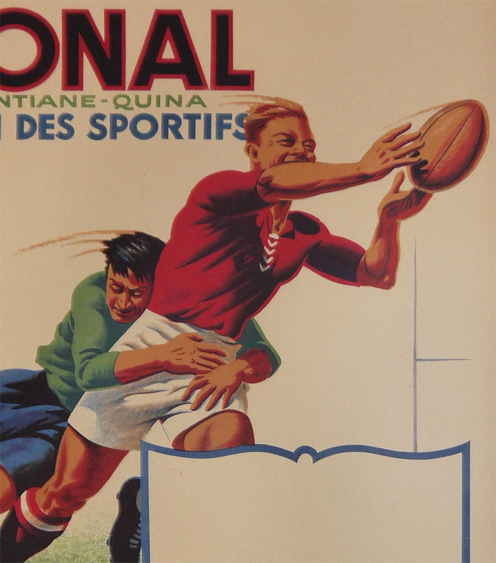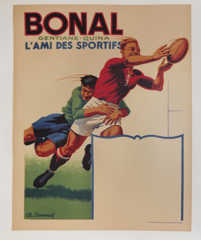 BONAL RUGBY ADVERTISING POSTER: Circa 1930's by French artist Charles Lemmel, Scene of 2 Rugby Players, text reads ''Bonal, Gentiane - Quina L'Ami Des Sportifs'', 31 1/2'' x 23 3/4'', backed with linen, 35 1/2'' x 27 3/4''.