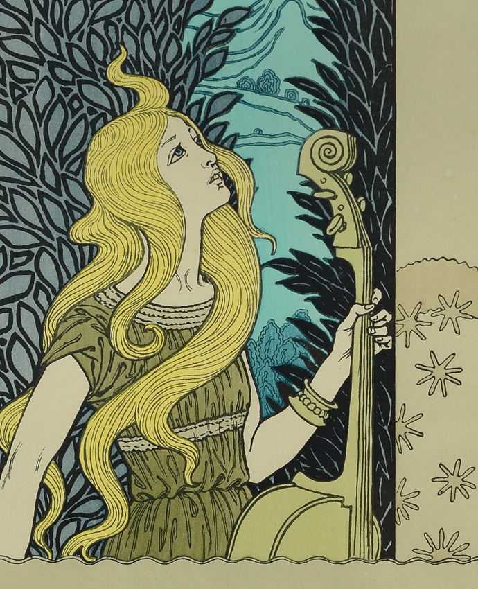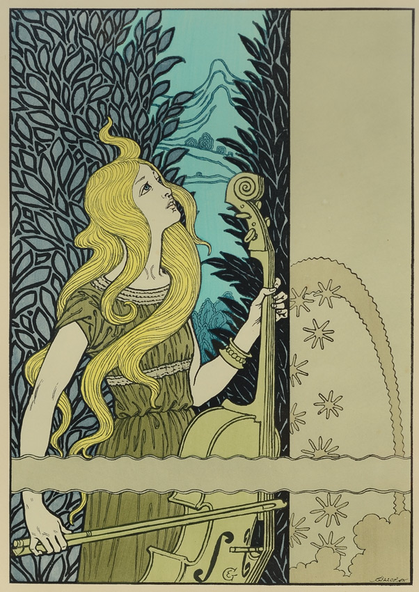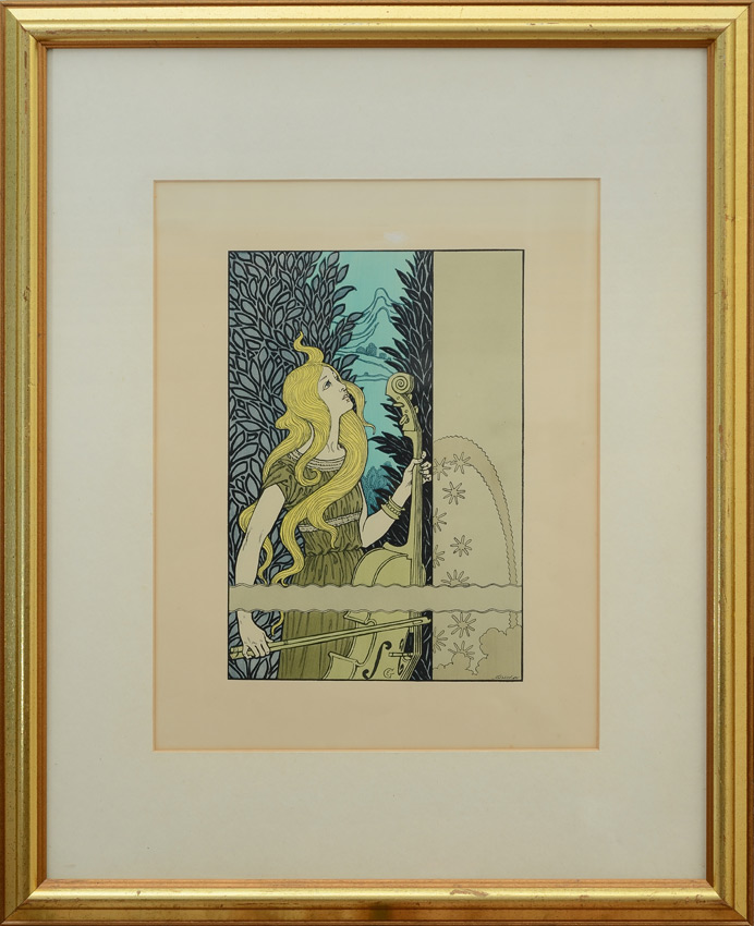 GRASSET, Eugene, (Swiss, 1841-1917): ''Violoncolliste'', art nouveau lithograph print of a woman with cello, open banner across lower third. Monogrammed EG, marked Gillotage lower right. Sight size 13 1/2'' x 10 1/2'', framed 22'' x 18''.