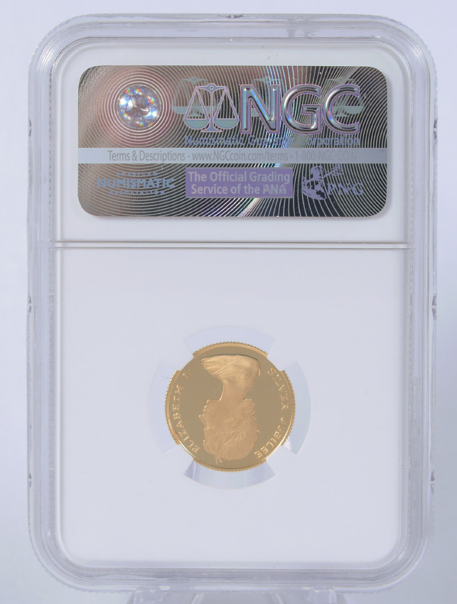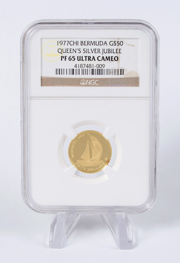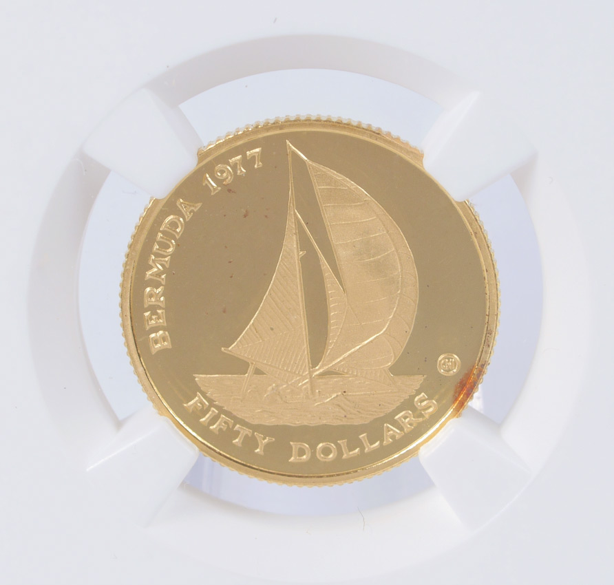 1977 BERMUDA $50 GOLD NGC PF 65 ULTRA CAMEO: Slabbed and graded by NGC PF 65 Ultra Cameo, 1977 Bermuda $50 Queens Silver Jubilee coin.
