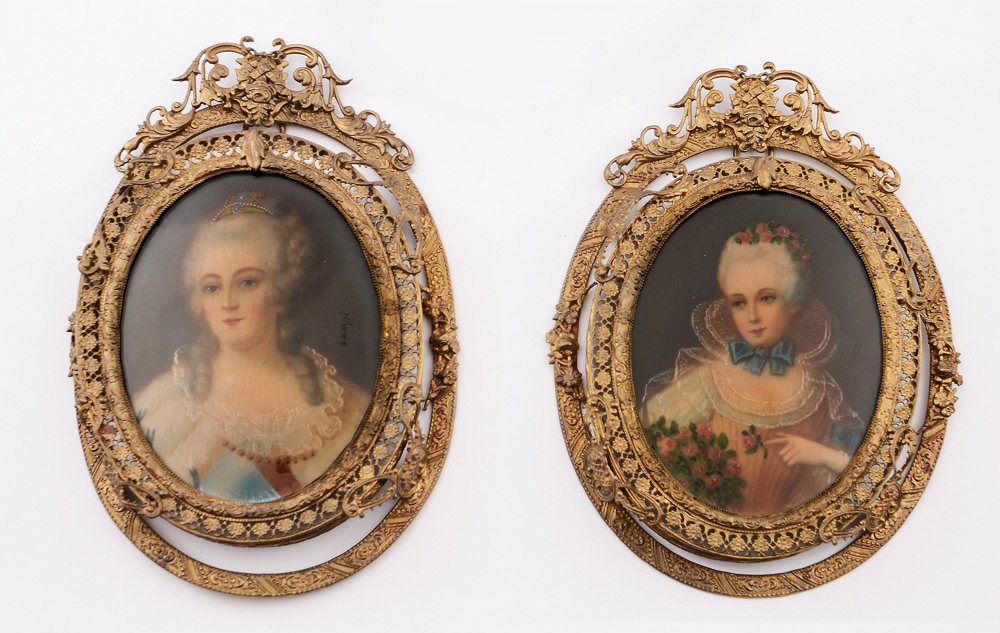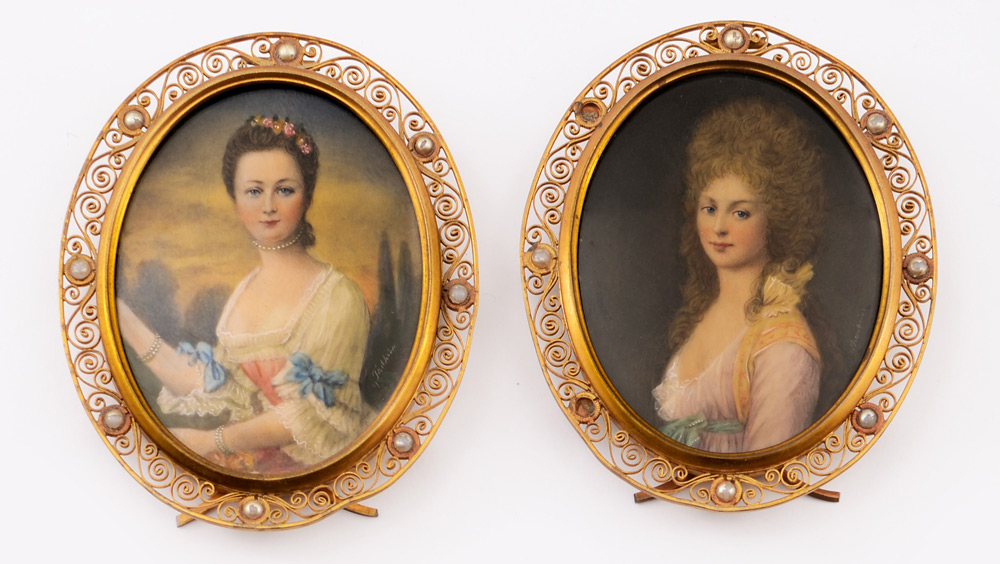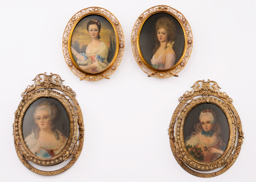 COLLECTION OF FOUR MINIATURE PAINTINGS OF BEAUTIES: All signed differently in different pierced metal frames, approximately 3'' x 2 1/2'' although measurements vary slightly.