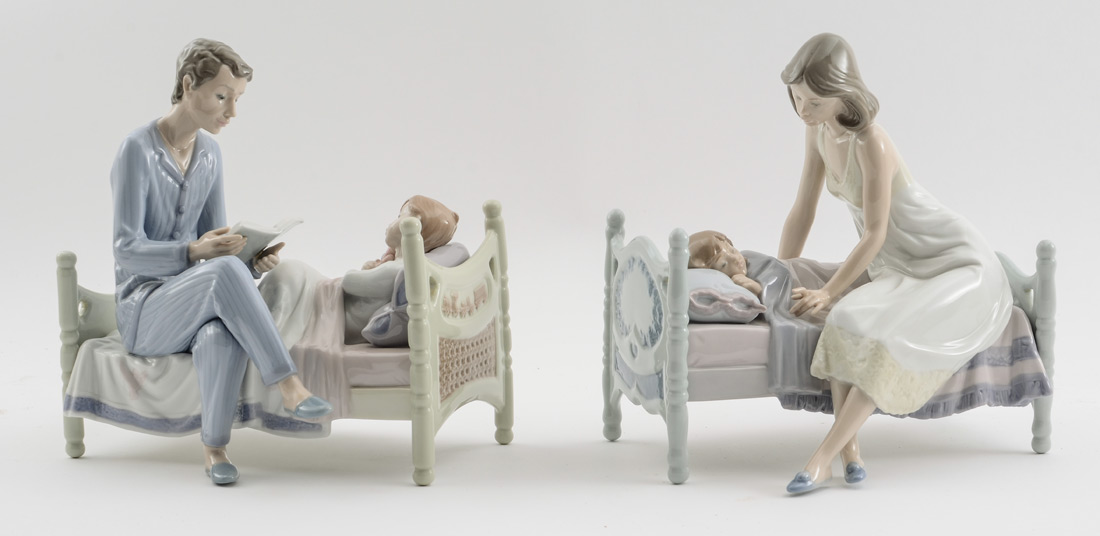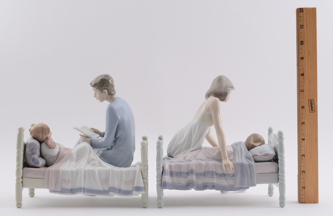 LLADRO PORCELAIN FIGURINES: 1) JUST ONE MORE #5899, Joan Coderch sculptor, issued 1992 retired 1997, 8.25''h. x 8'' x 6.5''. 2) SLEEP TIGHT #5900, Joan Coderch sculptor, issued 1992 retired 1997, 8.25''h. x 7.75'' x 6.25''.