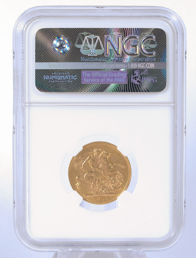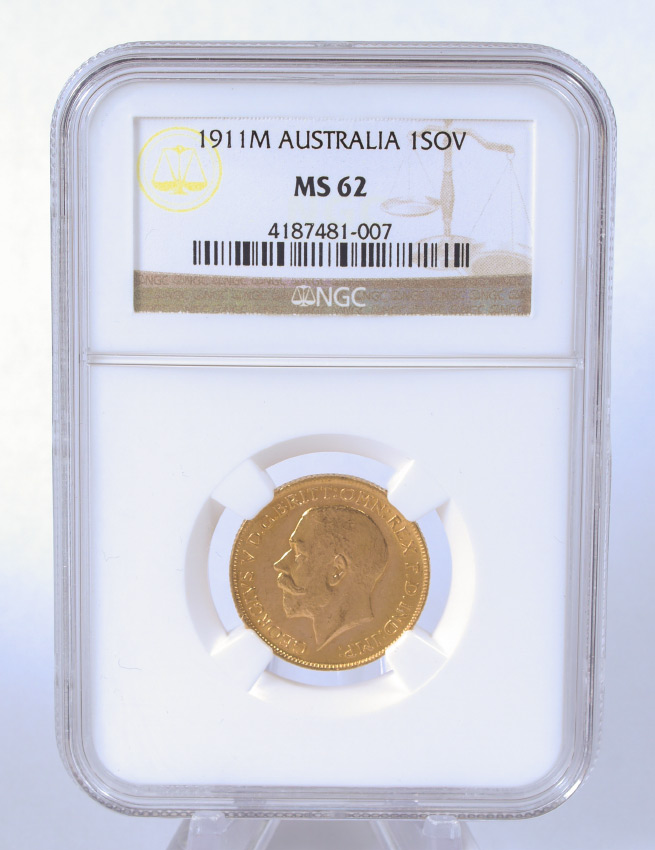 1911M AUSTRALIA GOLD SOVEREIGN NGC MS62: Slabbed and graded by NGC MS 61, 1911M Australian 1 gold sovereign coin.
