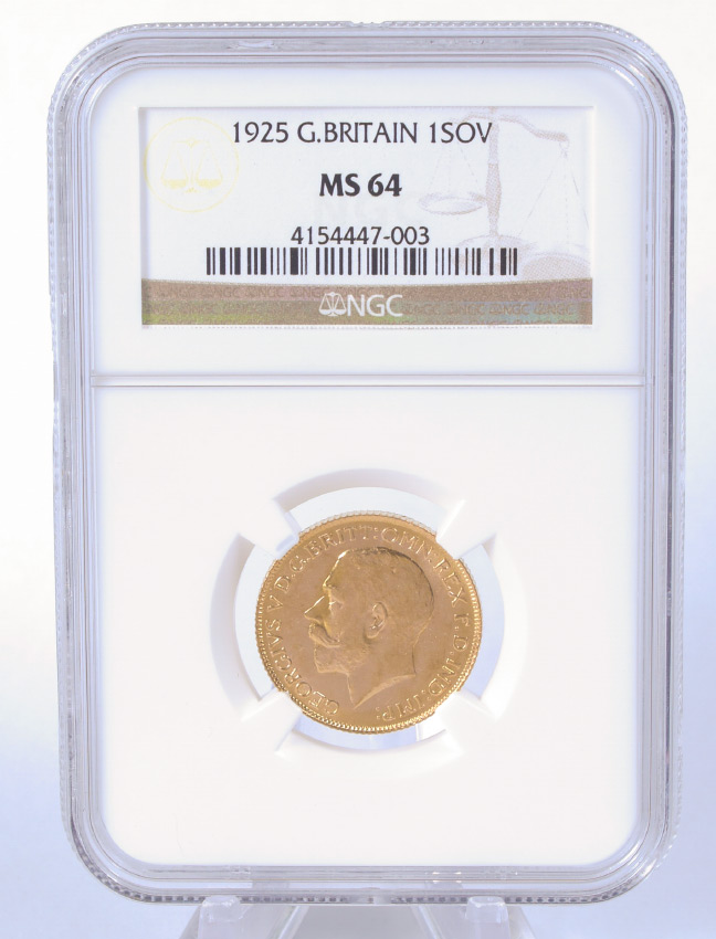 1925 GREAT BRITAIN GOLD SOVEREIGN NGC MS64: Slabbed and graded by NGC MS 64, 1925 Great Britain 1 gold sovereign coin.
