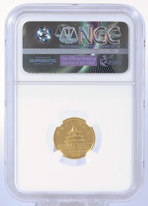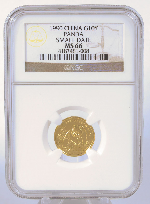 1990 CHINA 10 YUAN GOLD PANDA NGC MS66: Slabbed and graded by NGC MS 66, 1990 Chinese 10 yuan small date gold panda coin.