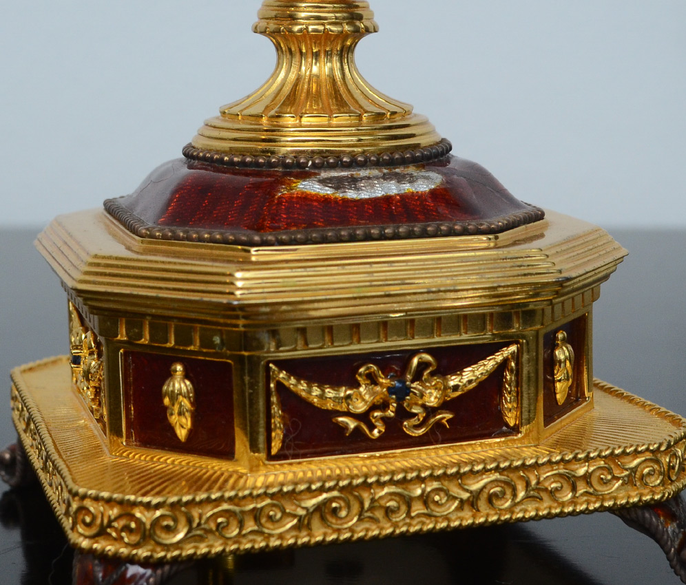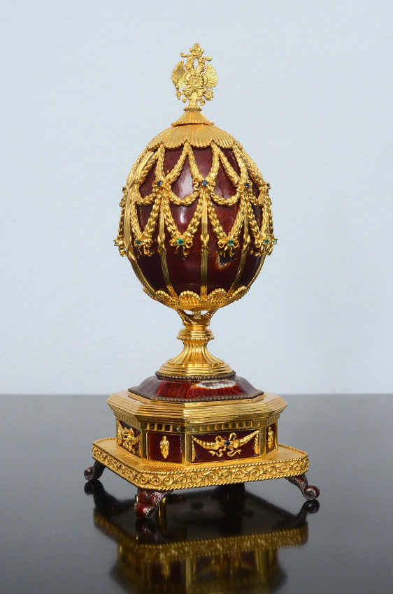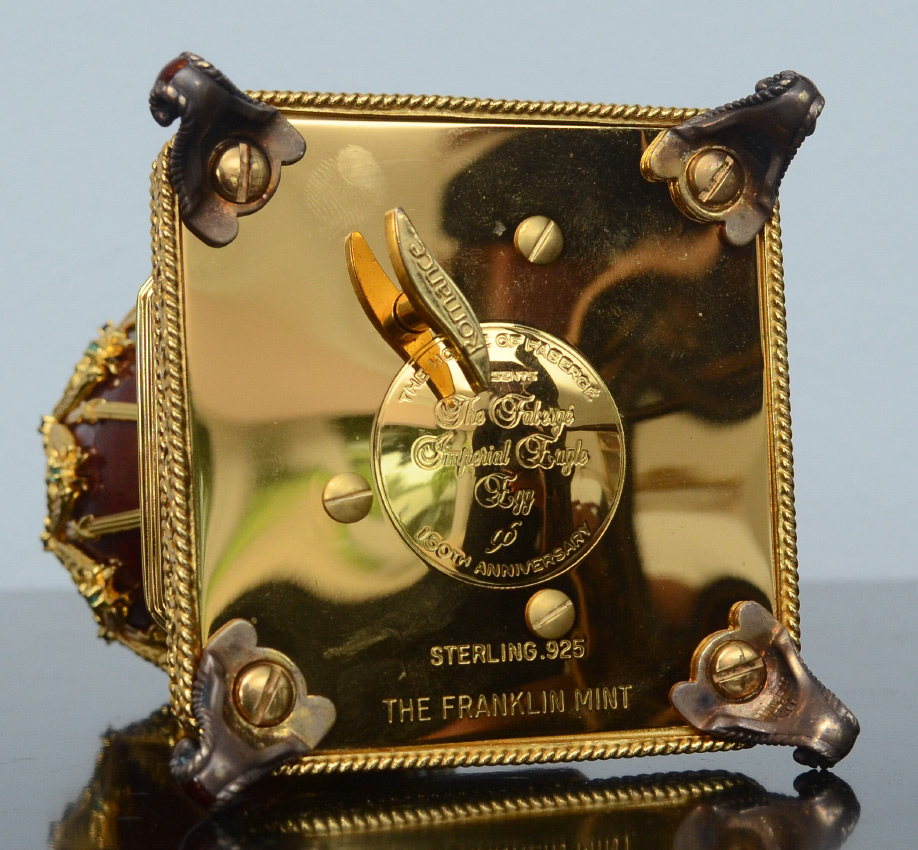STERLING MUSICAL HOUSE OF FABERGE EGG: Produced by the Franklin Mint, vermeil finish sterling egg over enamel, opens to reveal crown while playing music. Marked on base ''The House of Faberge Presents The Faberge Imperial Eagle Egg, 150th Anniversary, Sterling .925, Franklin Mint''. 8'' h. x 3 1/4'' x 3 1/4''. Sold with original presentation box, 11 5/8'' h. x 6 1/2'' x 6 1/2''.