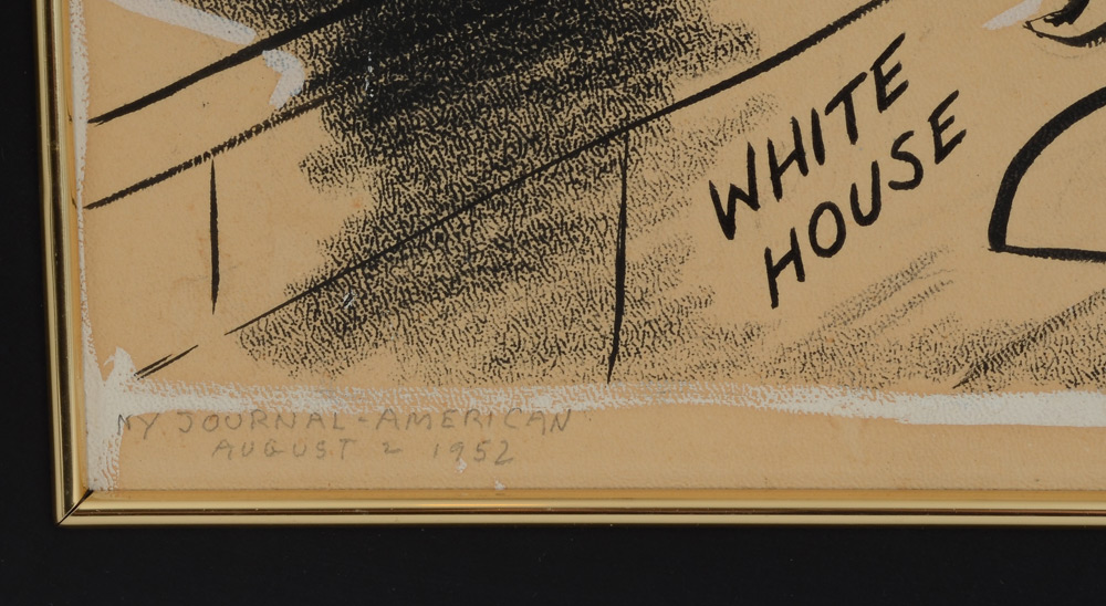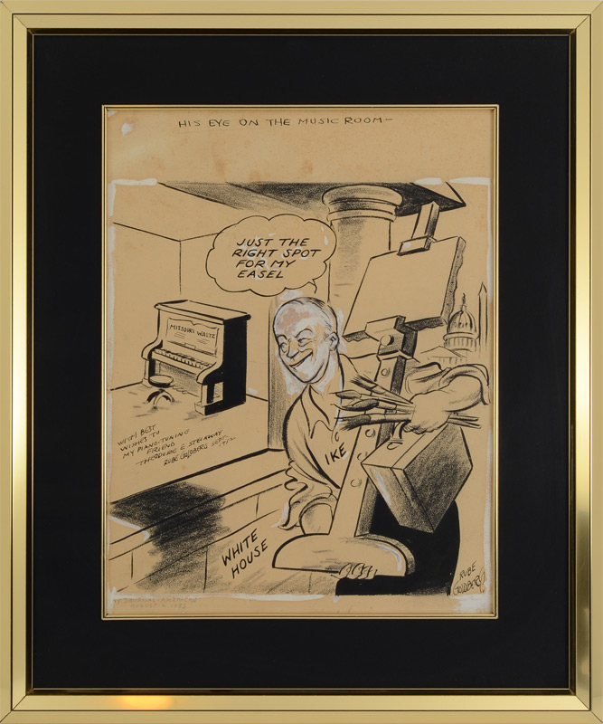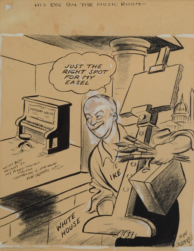 GOLDBERG, Rube, (American, 1883-1970): Original illustration of President Dwight Eisenhower preparing to move into the White House with his artist supplies and piano, Pen/Ink/Paper, titled ''His Eye on the Music Room'' and dedicated under the piano ''With Best Wishes to my Piano Tuning Friend Theodore E. Steinway, Rube Goldberg, Sept. 1952''. Also signed lower right, pencil inscription NY Journal - American, August 2, 1952. Sight size 14 1/4'' x 11'', framed and matted, 20 3/4'' x 17 1/2''.