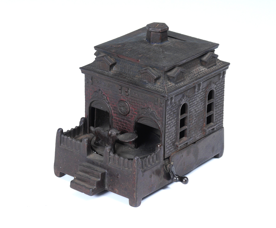 JUDD DOG ON TURNTABLE MECHANICAL BANK: Cast iron with a crank on the side, the dog on a turntable goes inside building to deposit coin. Late 19th century by Judd Mfg. Co., overall measures 4 3/4'' h. x 4'' x 5 1/2''.