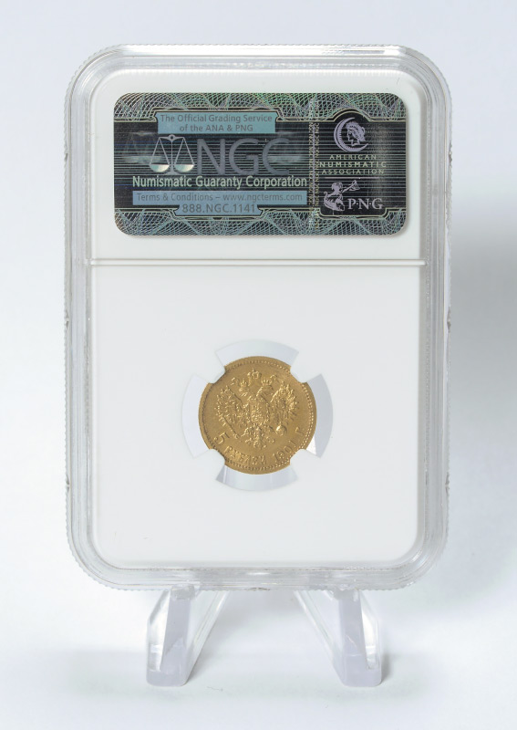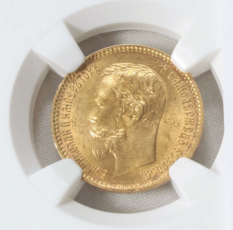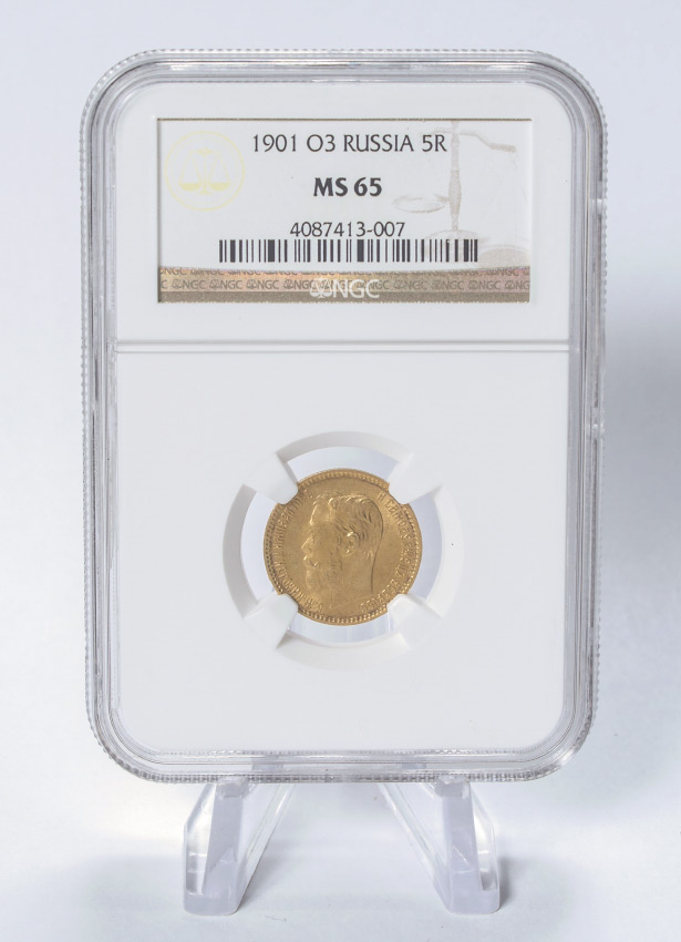 1901 RUSSIA GOLD 5 RUBLE NGC MS65: Slabbed and graded by NGC MS 65, 1901 Russian 5 Ruble gold coin.