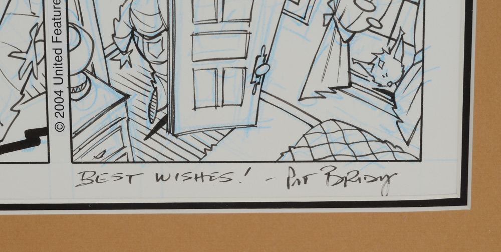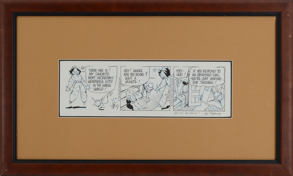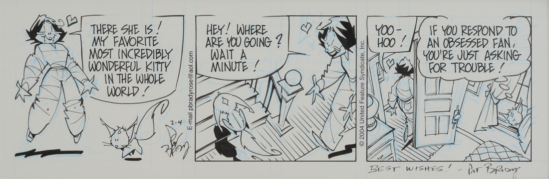 BRADY, Pat, (American, 1947-): Original daily cartoon strip for ''Rose is Rose'' dated 2-4, featuring Rose and Peekaboo the cat, signed and inscribed ''Best Wishes Pat Brady'' lower right.
