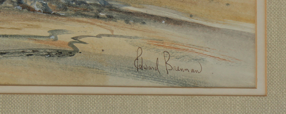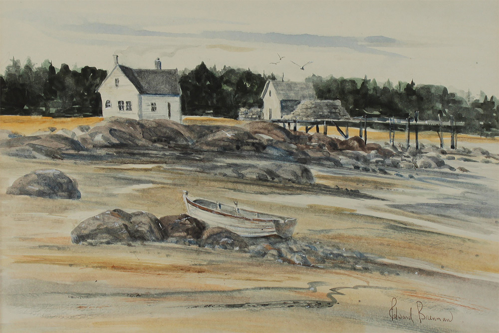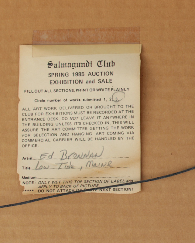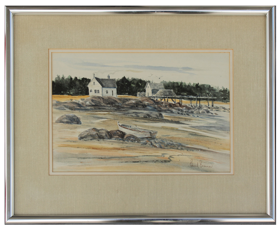 BRENNAN, Ed, (American, 20th Century): ''Low Tide in Maine'', Watercolor, sight size 9'' x 13 1/4'', signed lower right, Salmagundi 1985 Spring Auction label affixed verso, framed, 16 1/2'' x 20 1/2''.